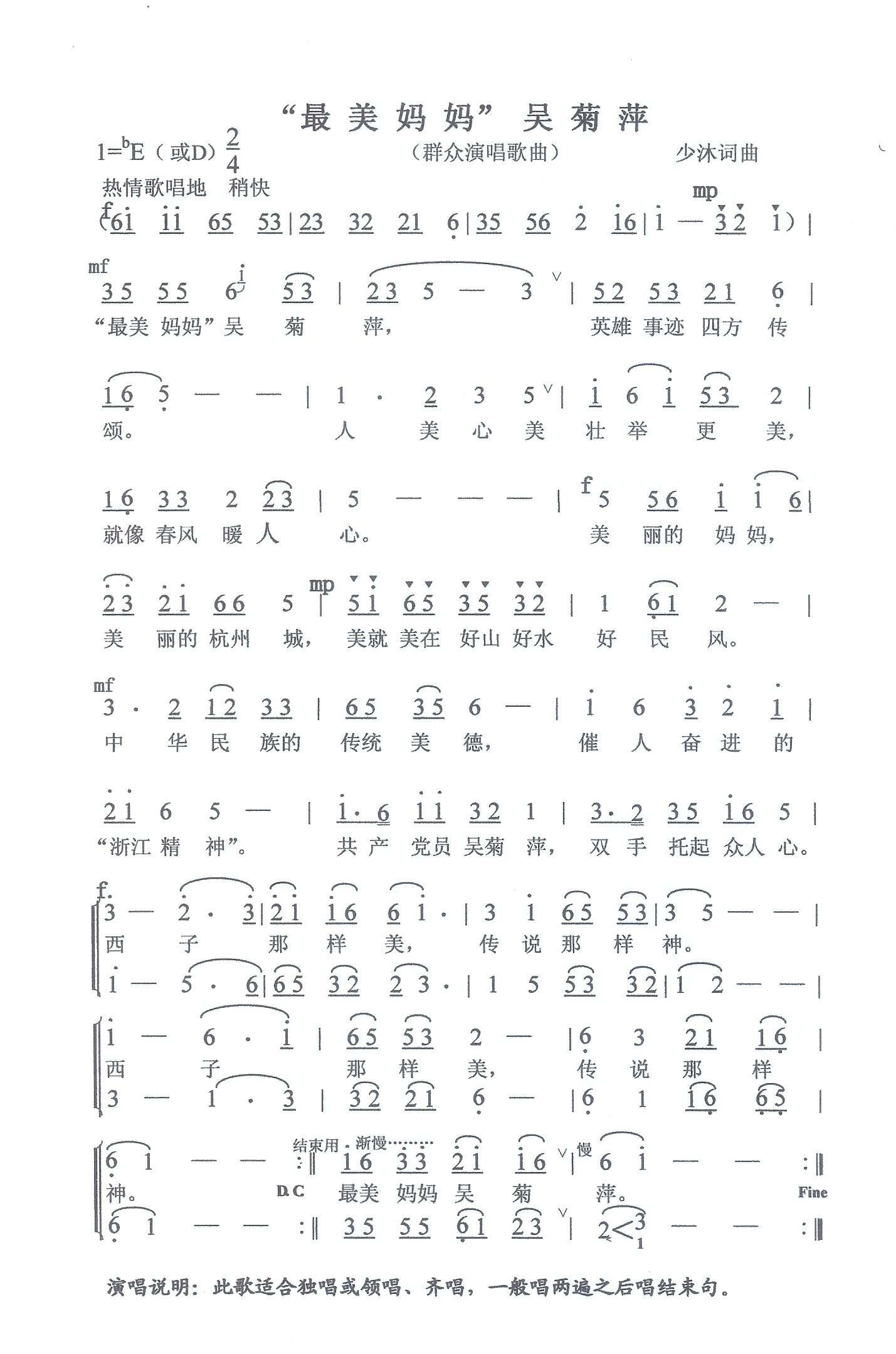 唱歌,应该是我们大家平常生活中的一部分,就把它看作像锻炼身体的走路、打球、跳舞、跑步那样,像大家打招呼、谈话一样,把它作为平常心态,平常行为来看待。今天校网发表一首歌唱吴菊萍的歌曲《最美妈妈“吴菊萍”》,作为提供大家演唱用。让我们大家一起行动起来,让学习英雄模范成为我们培育人才、净化心灵、美化社会环境、提高人民素质的重要手段,让吴菊萍常在我们的歌声中。唱起来吧!让歌唱美好蔚然成风。