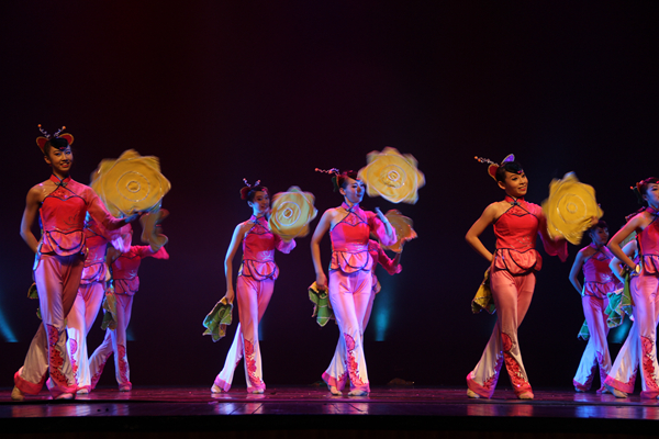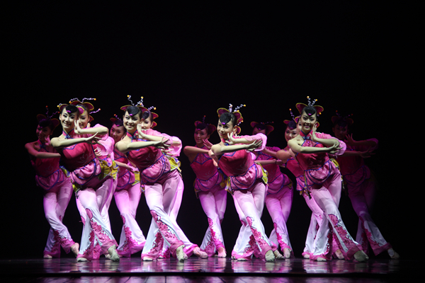 整台晚会,每个节目都出自大三下半学期的新剧目。 其中,女子群舞《蝴蝶飞》难度最大,全部由手绢花技巧组成。对于沈阳的女孩子们来说,手绢花技巧简直就是小菜一碟,因为这是她们从小玩到大的玩具啊!但是对于我们江南女子来讲,从刚开始的右手单手转起花到五十个为单位的转,再到左手也练习得像右手一样,然后双手一起转花,最后双人对面抛接花。从九月开学到毕业汇报前,手绢花陪伴着我们度过每一天。熬夜、通宵早已是家常便饭。