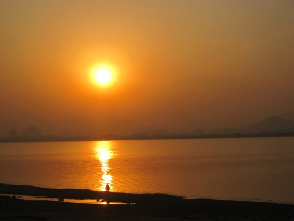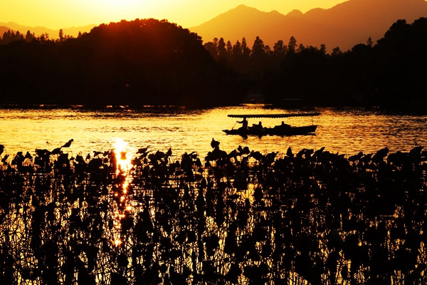 夕阳西下此时的西湖仿佛被镀上了一层金,波光粼粼,熠熠生辉。。(摄影:学生记者 支璇琪)