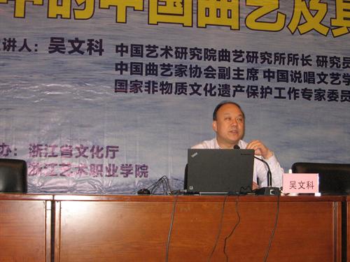 10日,中国艺术研究院曲艺研究所所长、博士生导师吴文科讲演的标题是《非物质文化遗产视野中的中国曲艺及其保护策略》。他以自身30年曲艺研究的理论积累,加以中国曲艺家协会副主席、国家非物质文化遗产保护工作专家委员会委员的工作实践,从曲艺作为非物质文化遗产的典范属性入手,谈及了正确认识曲艺是科学保护曲艺的前提,保护曲艺要结合曲艺的实际以便对症下药,保护曲艺要有切实可行的方式与方法等实际问题。