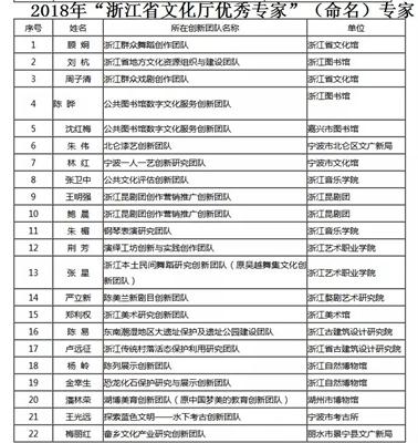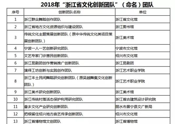 据悉,2018年,全省共评审出“浙江省文化创新团队”(命名团队)13个,“浙江省文化厅优秀专家”22名,“浙江省文化创新团队”(入围团队)39个。