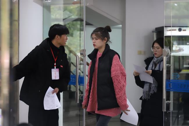 初冬的寒冷抵挡不住考生们的热情,一大清早就有考生前来排队。考生随着银杏叶铺成的金黄色小道走进报到现场,布告栏上写着考试温馨提示,交代了考试规则、考生守则、考生须知等信息。