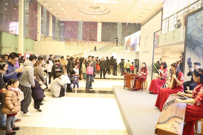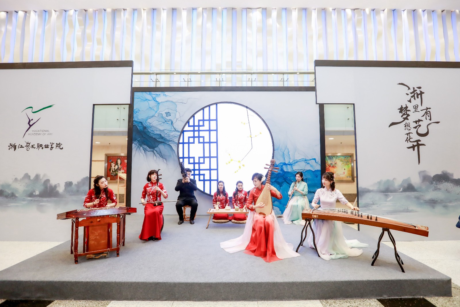 演出前,浙艺在杭州剧院大厅进行了“浙艺乐舞”“浙艺手艺”“浙艺腔调”展示,吸引众多观众驻足欣赏。琵琶古筝扬琴笙箫,音乐系赵瑾、肖思宁、夏金瓯、常轶伟等老师率领音乐学子现场演绎的江南丝竹音乐,明朗轻快,旋律悠扬,吸引观众驻足;金缮石雕装裱青瓷,文化管理系朱伟洁、郑源雷、江杰、孙艺萌、韩承佐等老师率领学生以手作之美,向观众传递浙艺对传统技艺的坚守与传承,也送上新春祝福与希望。现场视频播放的“‘浙曲流觞’本土民族音乐保护推广”“浙江本土音乐原创作品研究与推广”“浙艺手艺”等浙艺省级文化创新团队和作品,令观众心向往之。