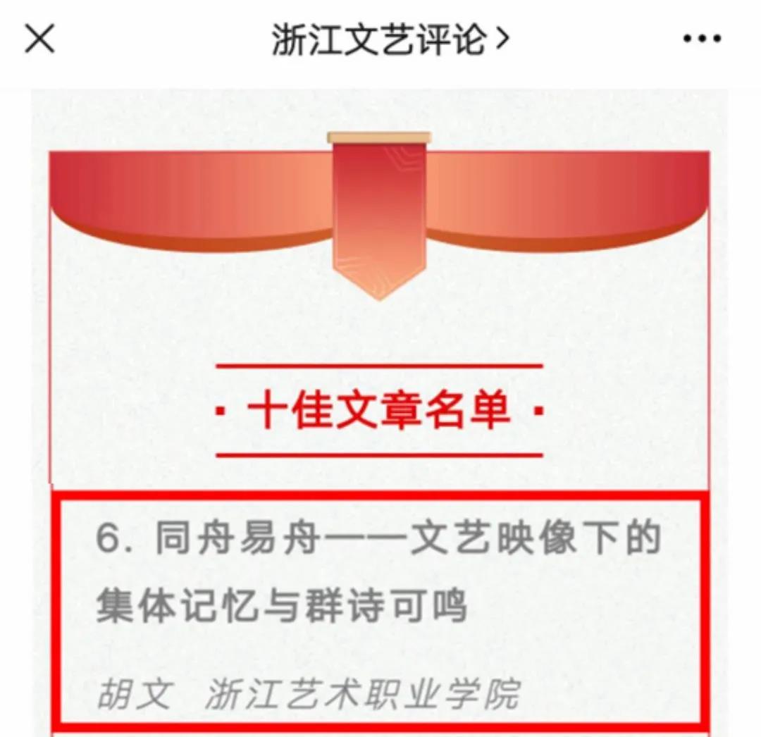 由浙江省文艺评论家协会举办,以“文艺与人类命运共同体”为主题的第三届浙江省高校青年文艺评论征文上,19公共文化学生胡晶莹(胡文)的《同舟易舟——文艺映像下的集体记忆与群诗可鸣》获“十佳文章”,是唯一一名获奖的高职院校学生。