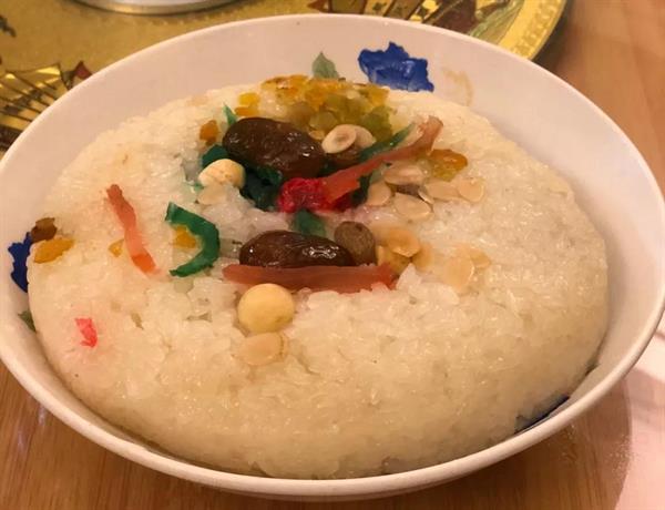 我是来自文化管理系18定向2班的潘可蓥,来自杭州桐庐。吃八宝饭是我们这里过年的传统习俗。八宝饭的主要食材是糯米,中间裹着甜豆沙,在上面撒上红枣、莲子、瓜子仁、葡萄干、桂圆干、红绿丝,分量足,味道甜,象征着吉祥平安和团团圆圆,年味十足。
