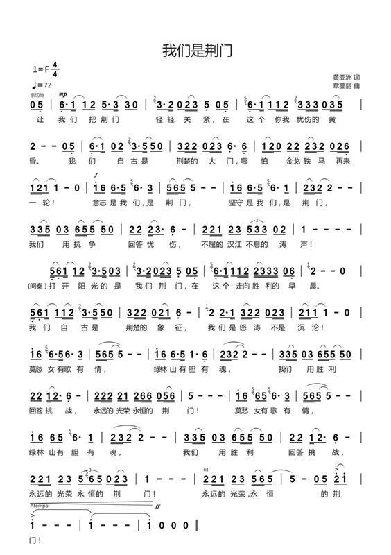 我们自古是荆楚的象征,莫愁女有歌有情,绿林山有胆有魂,我们用胜利回答挑战,永远的光荣,永恒的荆门。伴随着湖北疫情突发、浙江医疗队紧急支援荆门的新闻画面,一首女声独唱《我们是荆门》温柔中蕴含坚强力量,唱出了浙江和荆门携手抗击疫情的深厚情谊和坚定信心。