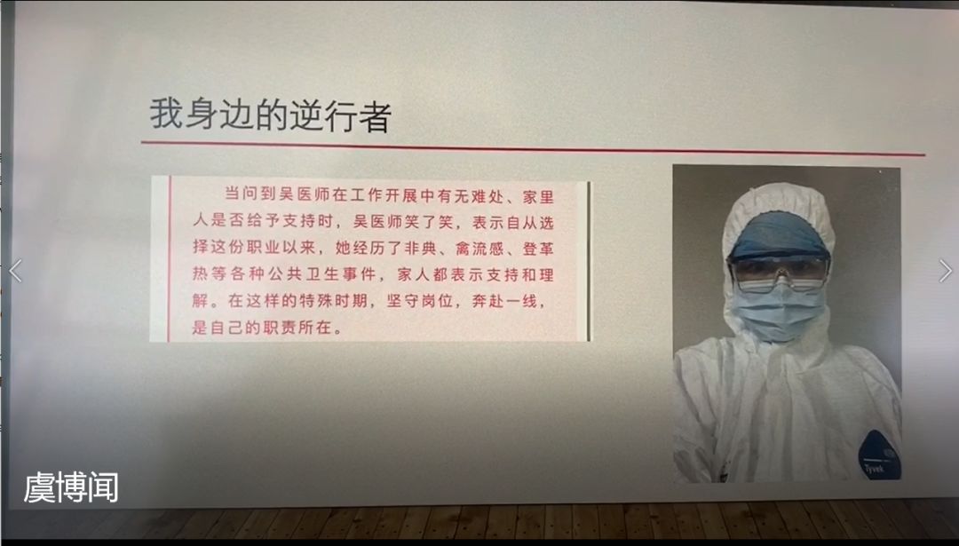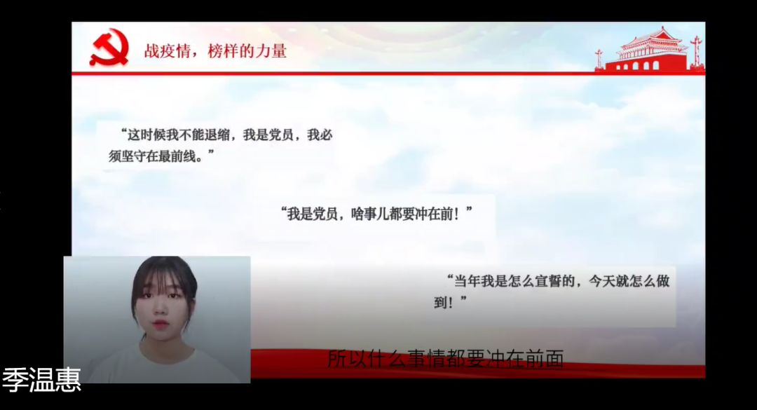 40名学员从不同角度阐述了对疫情的认识,述说了医护工作者、援鄂医疗人员、解放军战士、志愿者、爱心人士以及身边人的担当作为和感人事迹,运用生动的故事、鲜活的案例、朴实的语言,讲所思所想、表真情实意、敬“战疫”先锋。