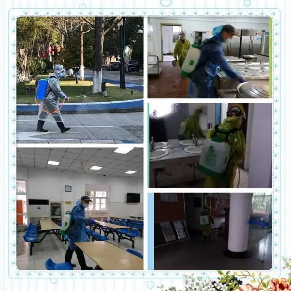 后勤公司第一时间购买消毒水、防护口罩、背负式喷雾机、洗手液等防控物资。成立消杀小组负责各楼宇、卫生间、食堂、岗亭、校园等公共场所的每日消杀工作,并做好记录,让在校抗疫的一线老师和工作人员放心、安心。