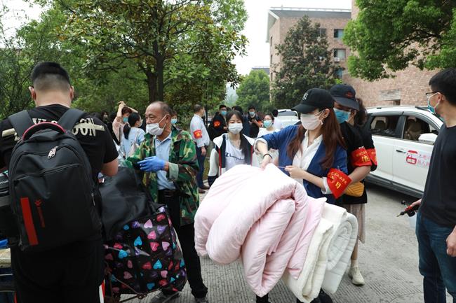下车后再次测温并进行行李消杀,老师还贴心地帮同学们搬运行李。同学们出示完“一码一证一温"(杭州绿色健康码、身份证(学生证)、体温测量筛查), 符合要求后就可以进入公寓。