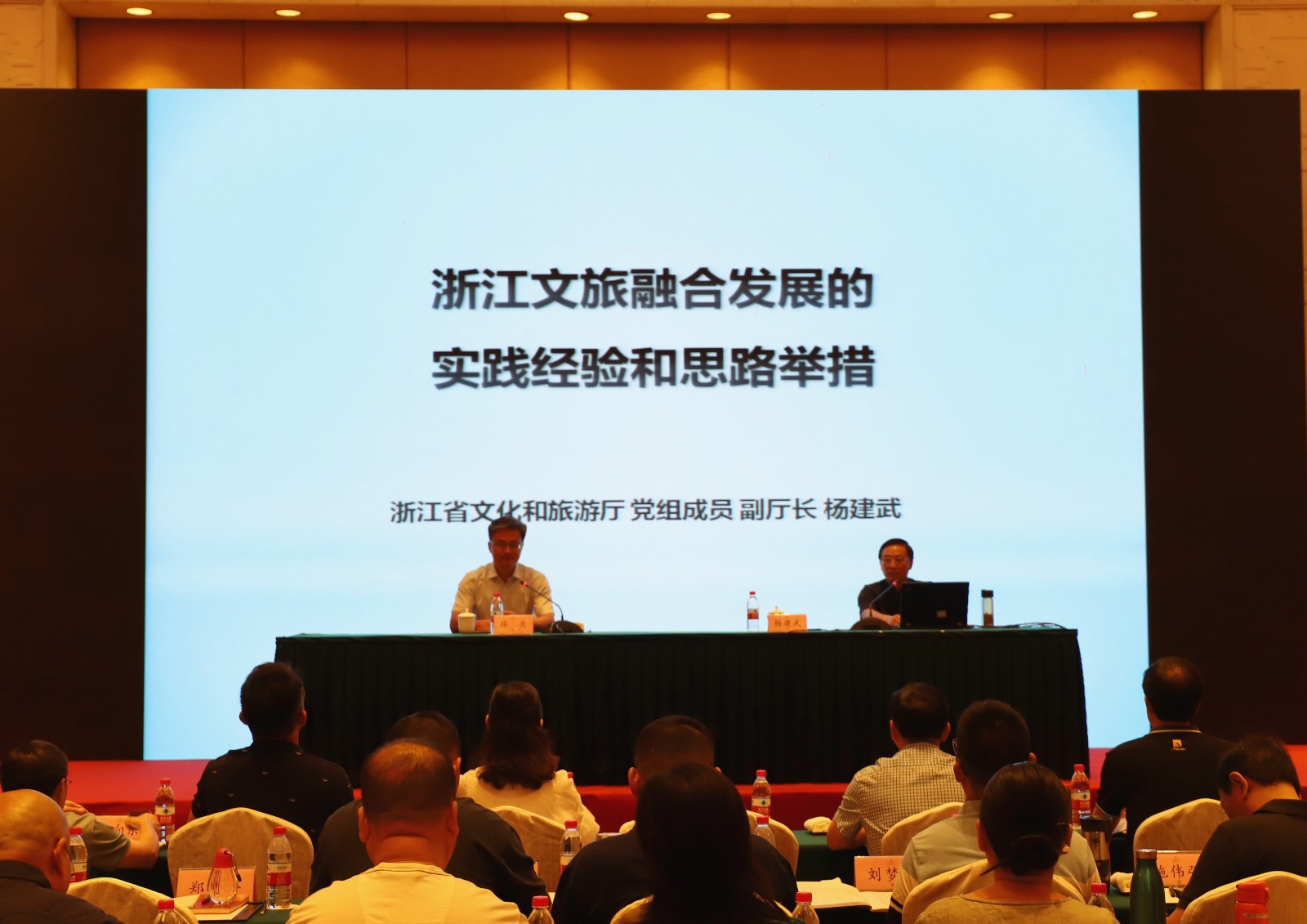 省文化和旅游厅党组成员、副厅长杨建武作题为《浙江文旅融合发展的实践经验和思路举措》专题报告。图文并茂地分析了全省文旅融合发展的现状,从浙江是文化和旅游资源大省、浙江是文化和旅游经济强省、浙江是文旅融合发展的先行省、浙江要争当文旅融合发展的示范省等四个方面分析了我省文旅融合发展的实践经验和思路举措,并从“合”字的本义,阐述了文化和旅游融合的本意和初心,案例丰富、内容详实,让与会干部开阔了视野,拓宽了思路。