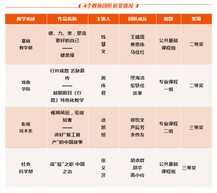 8月30日,由浙江省教育厅主办的2020年全省高职院校教学能力比赛现场决赛在宁波落下帷幕。我校选送的4个教师团队在与全省49所高职院校的270个团队角逐中,全部获奖,其中二等奖2项,三等奖2项,较去年有所提高。 获奖情况分别是:戏曲学院教师周伟君领衔团队获二等奖,基础教学部教师钱慧文领衔团队获二等奖,影视技术系教师徐旭恒领衔团队获三等奖,社会科学部教师张义莎领衔团队获三等奖。