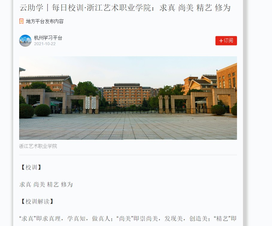“求真”即求真理,学真知,做真人;“尚美”即崇尚美,发现美,创造美;“精艺”即学无尽,艺无涯,精技艺;“修为”即修其身,立其德,知荣辱。