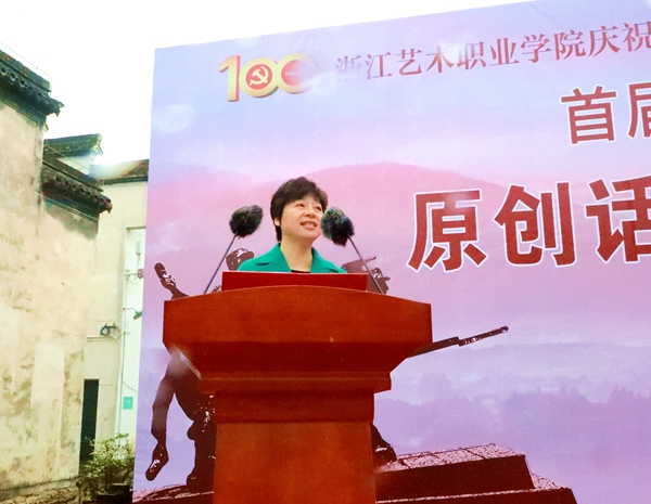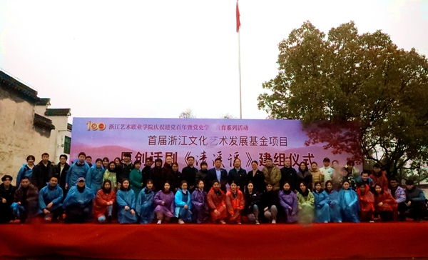 夏开堂作讲话,他代表学校,向参与话剧创作和演出的老师们、同学们致以问候,向中共长兴县委宣传部、长兴县文旅体局、长兴县文旅集团、长兴县煤山镇人民政府表示感谢。浙艺作为全国唯一一所入选“双高计划”的综合性高职艺术院校,话剧《清溪谣》的创作是戏曲表演专业建设群的一项成果。在全党上下正在开展党史学习教育之际,话剧《清溪谣》开排适逢其会,他要求浙艺师生们讲好中国共产党故事,创作和演绎展示党的伟大历程、伟大成就的优秀作品,为“文化浙江”“诗画浙江”建设提供有力人才支撑,在浙江“重要窗口”建设中发出浙艺声音、贡献浙艺智慧。