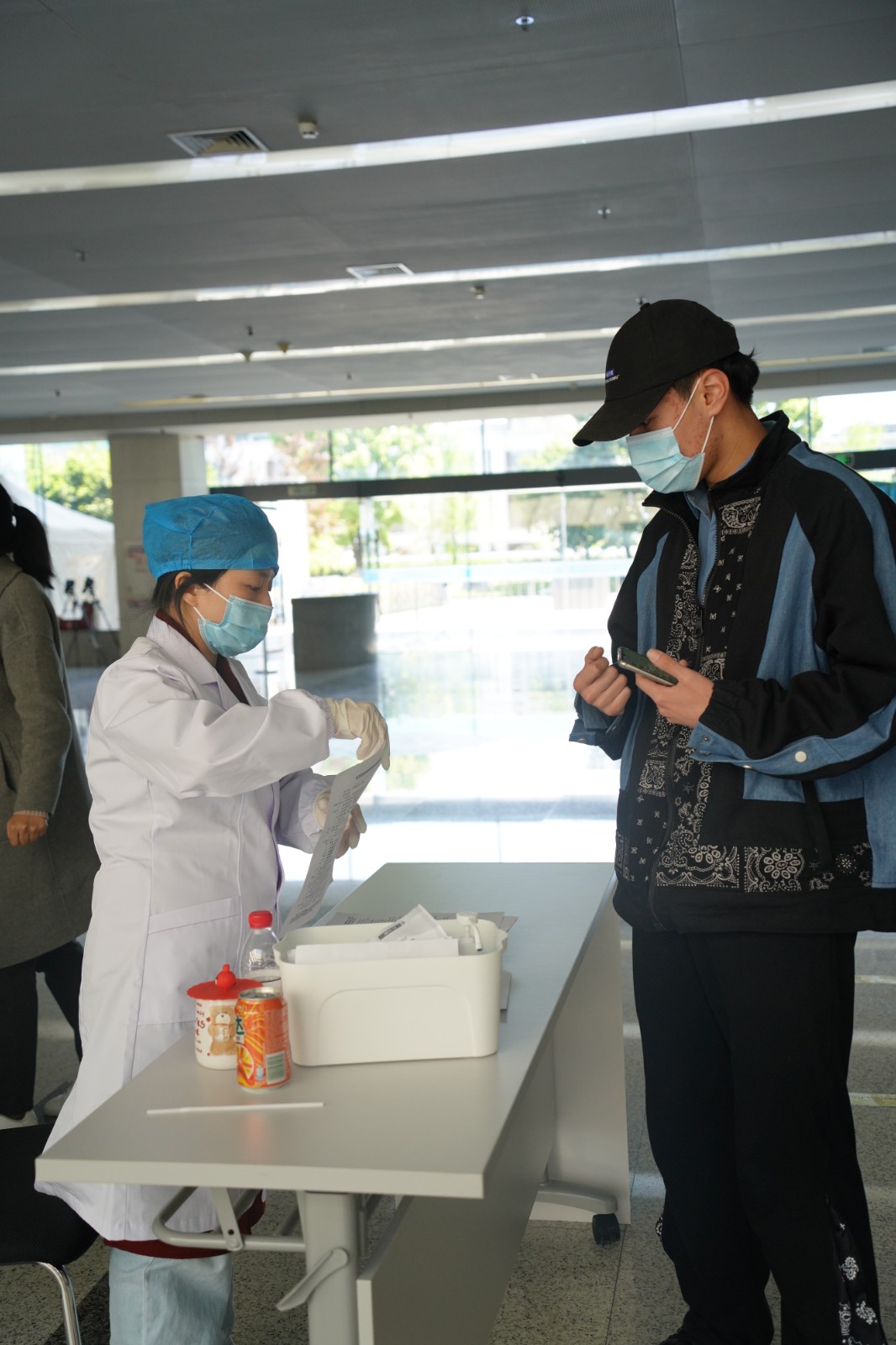 当天,浙江中医药大学学生也进行了集体接种,图为在排队测温进场