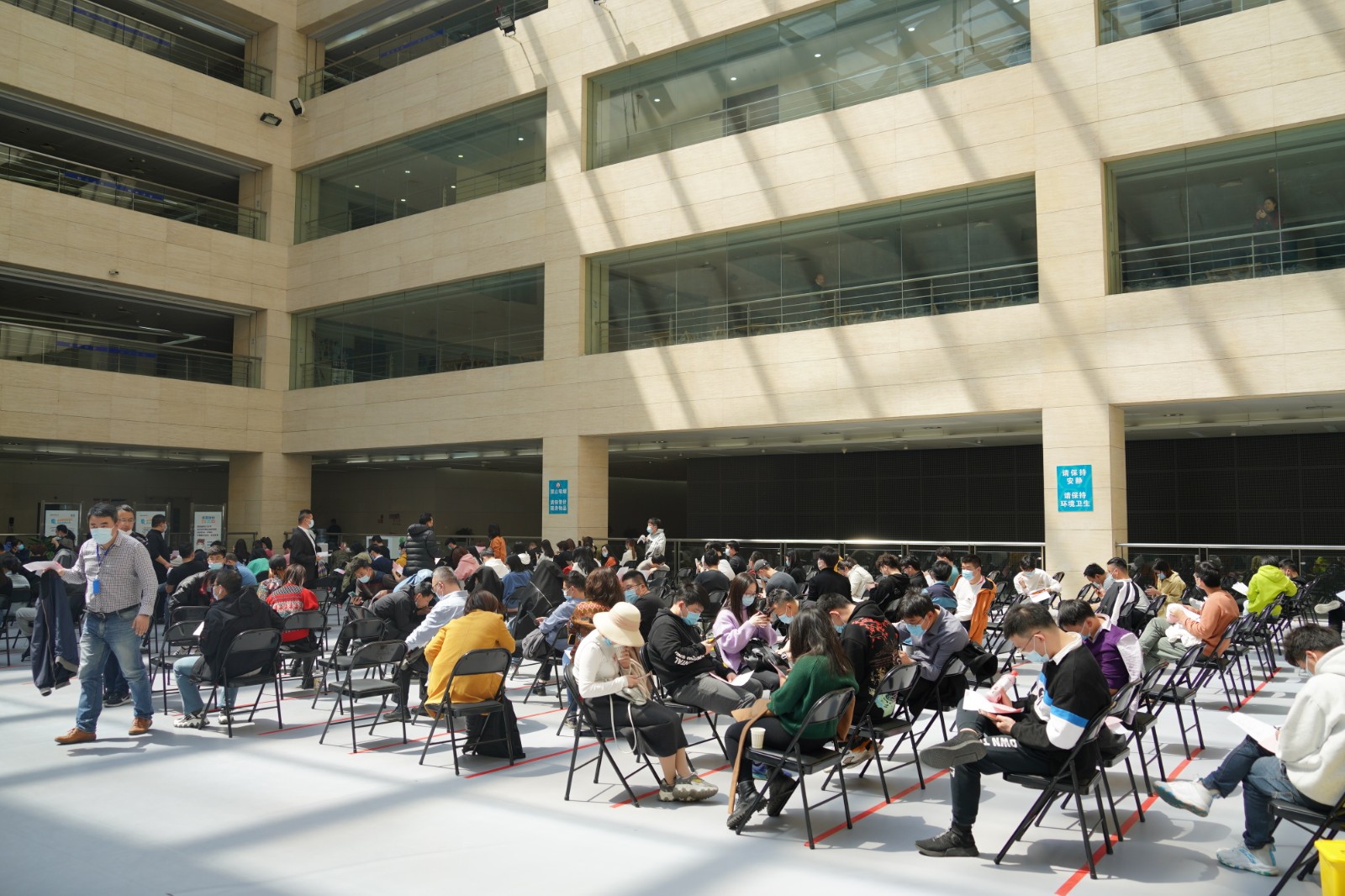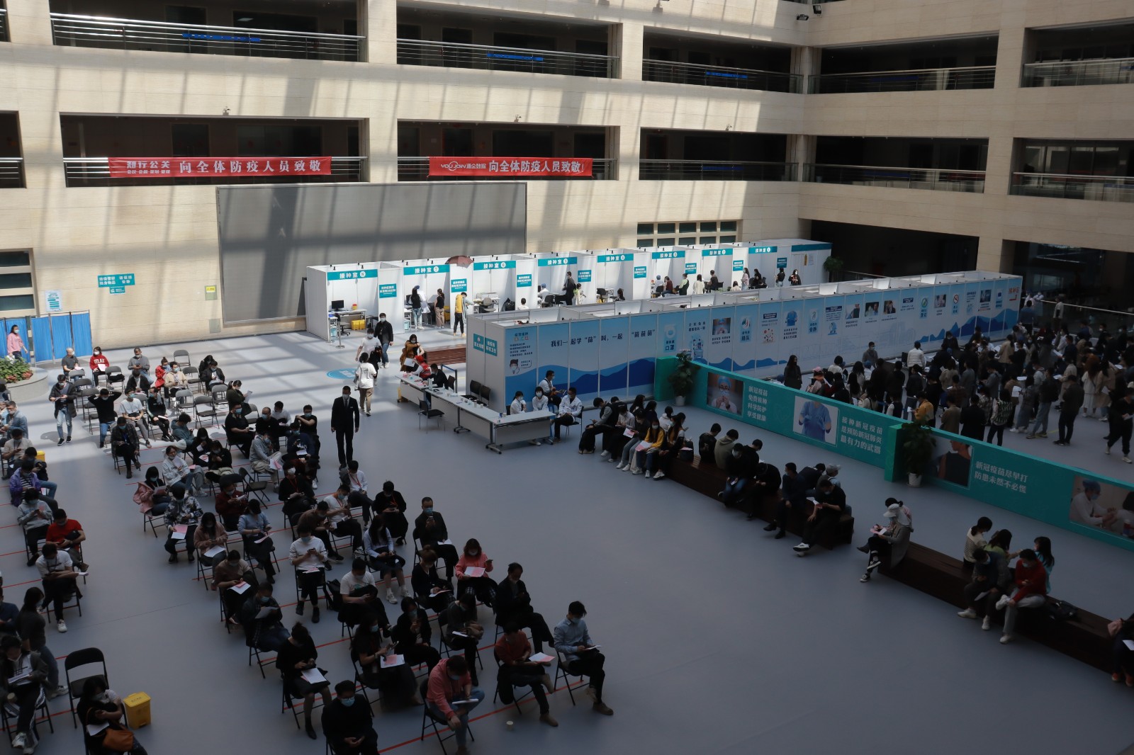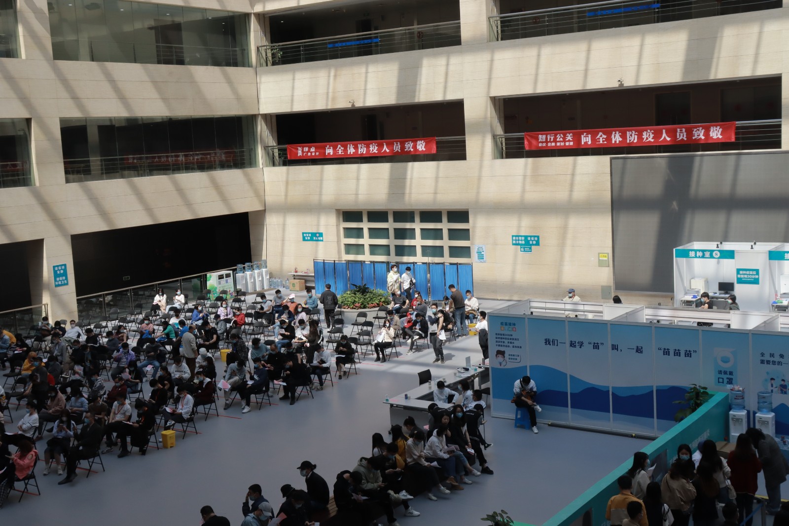 方舱临时接种点按照流程设置了多个功能区域,进出都是单向通行,设置有多条引导咨询通道,12个预检台、16个接种室、上百个留观座位,确保接种工作顺利进行。