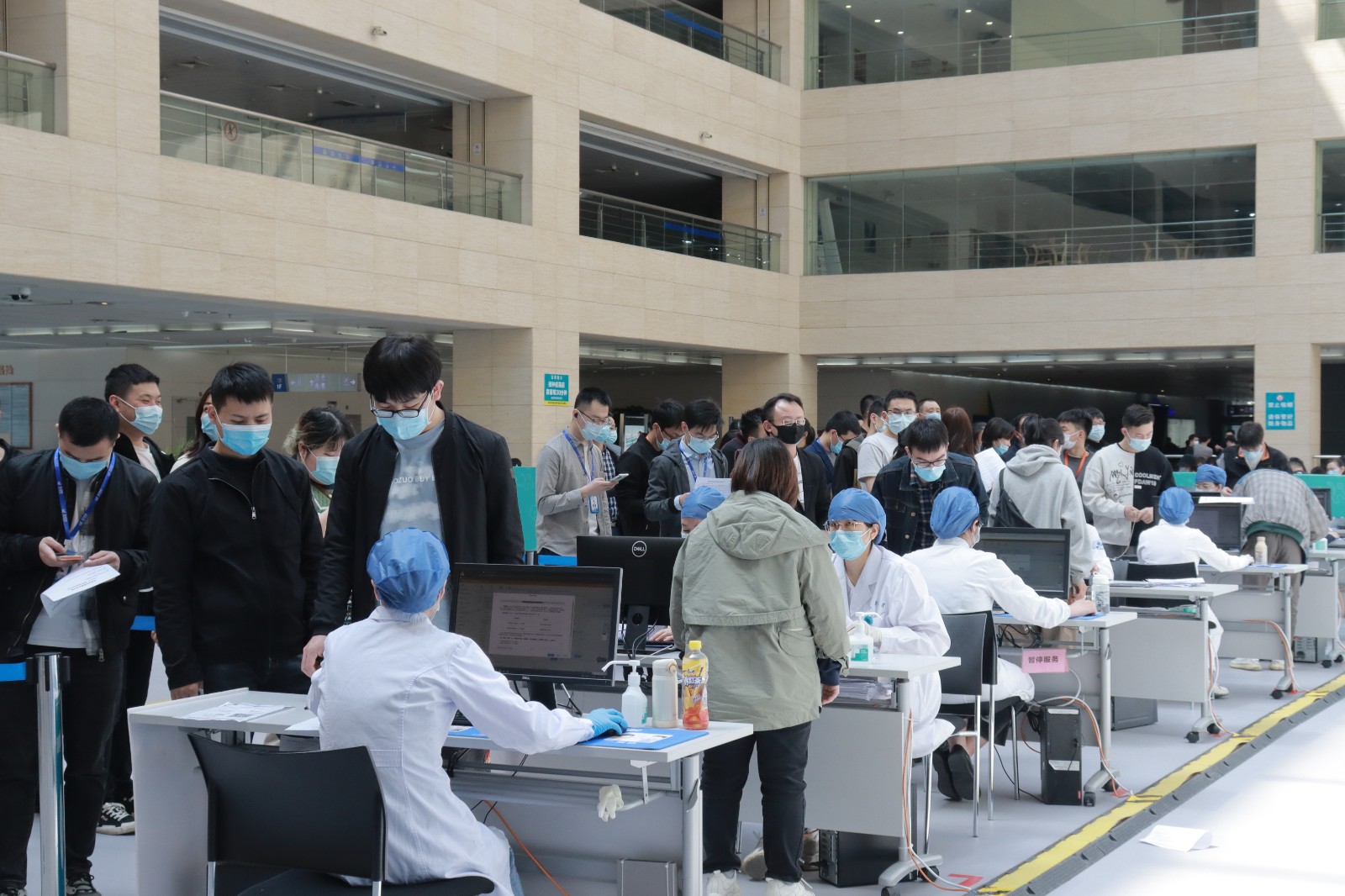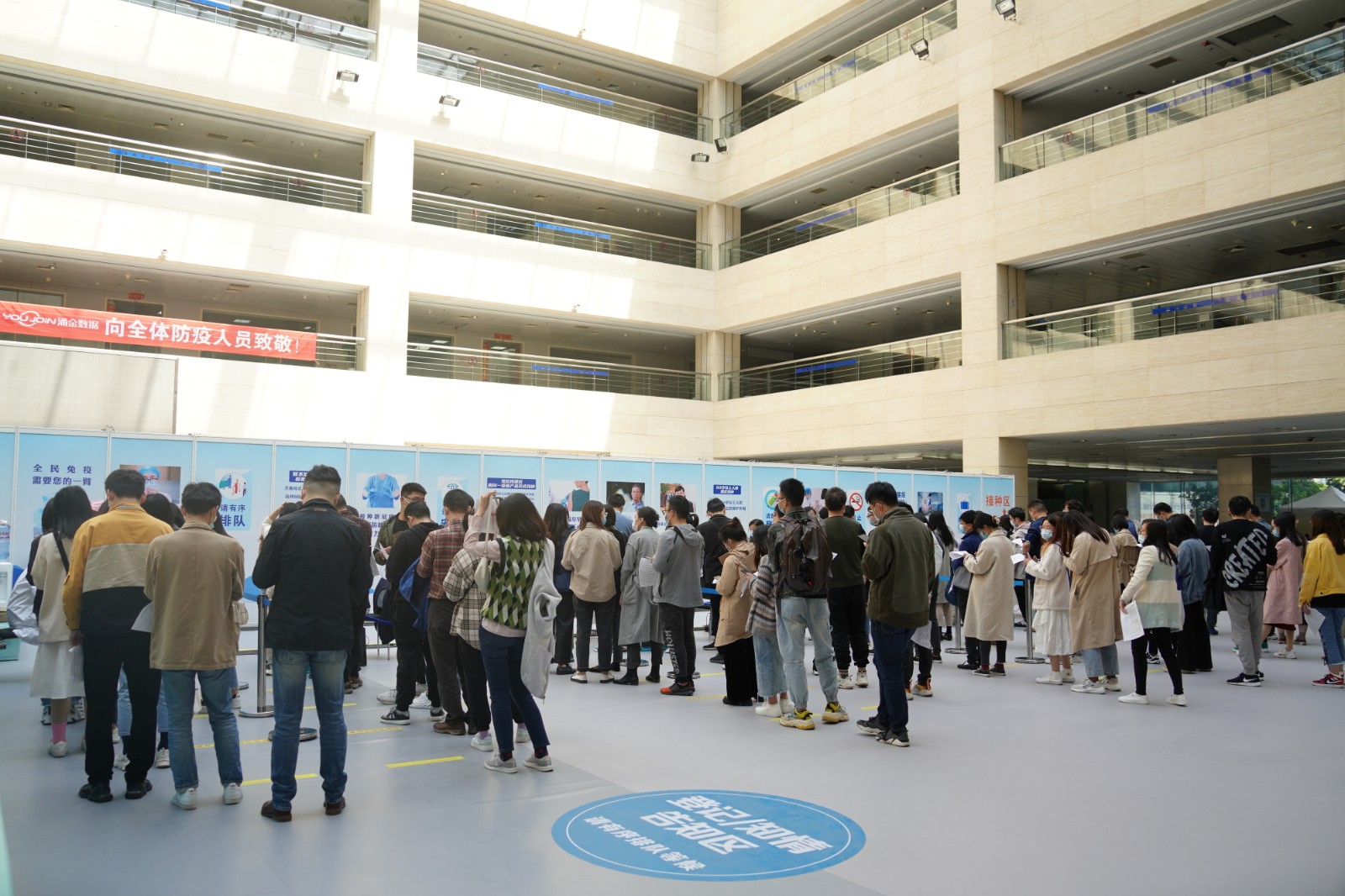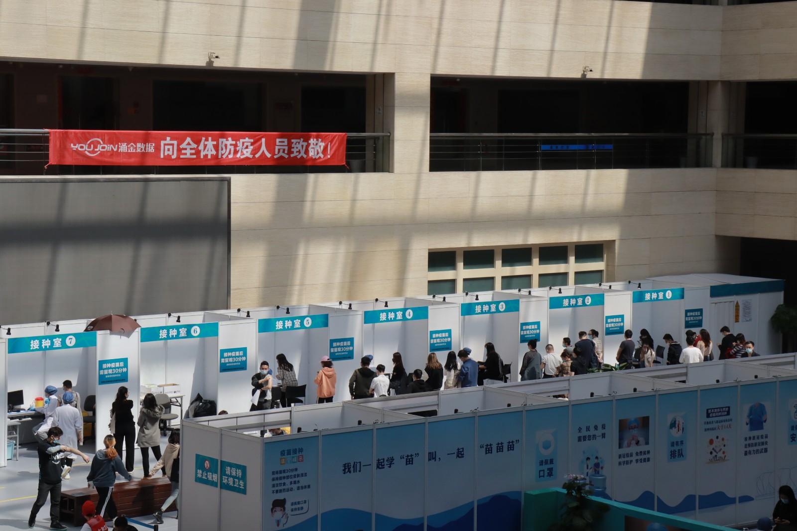 方舱临时接种点按照流程设置了多个功能区域,进出都是单向通行,设置有多条引导咨询通道,12个预检台、16个接种室、上百个留观座位,确保接种工作顺利进行。