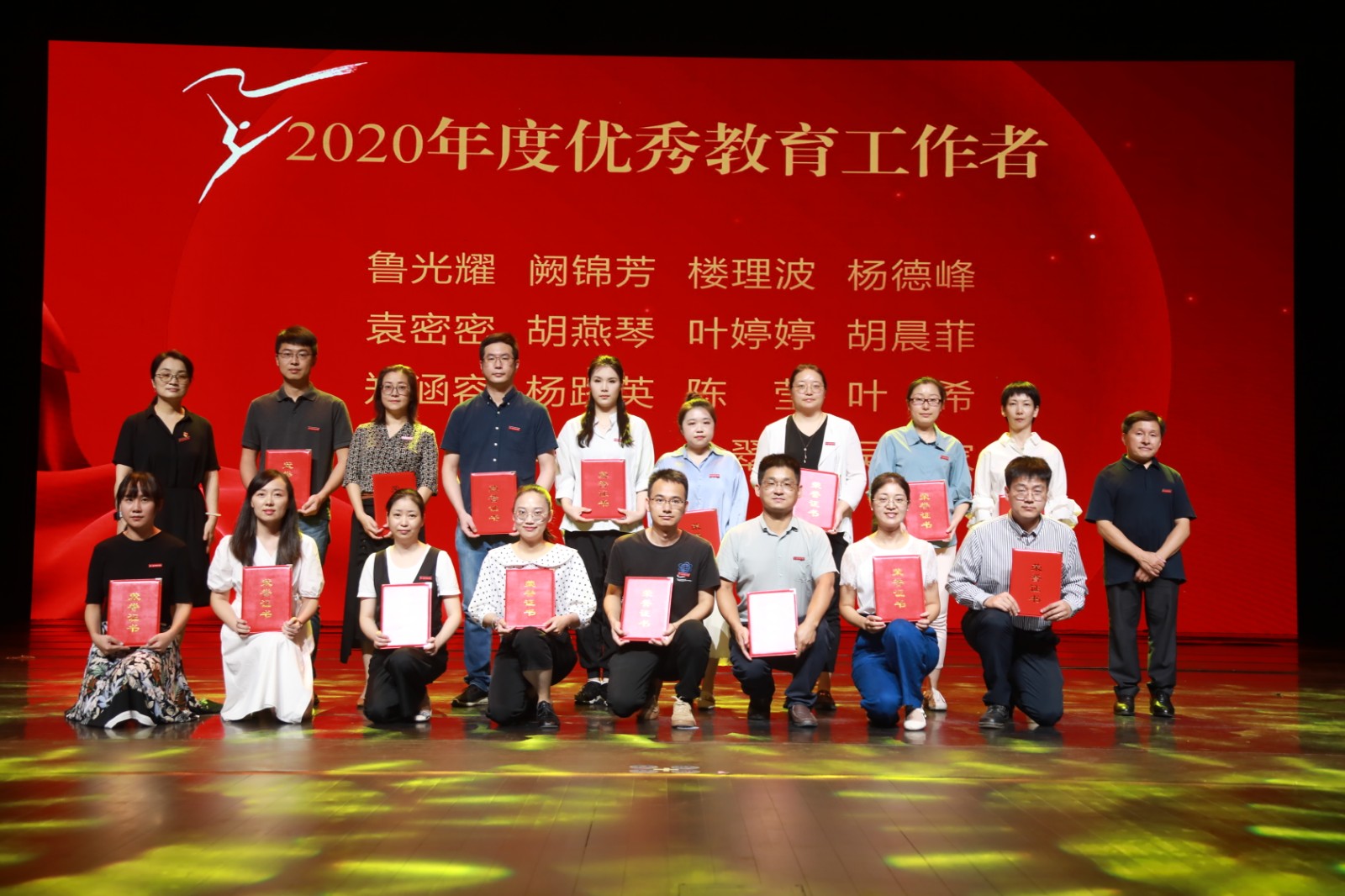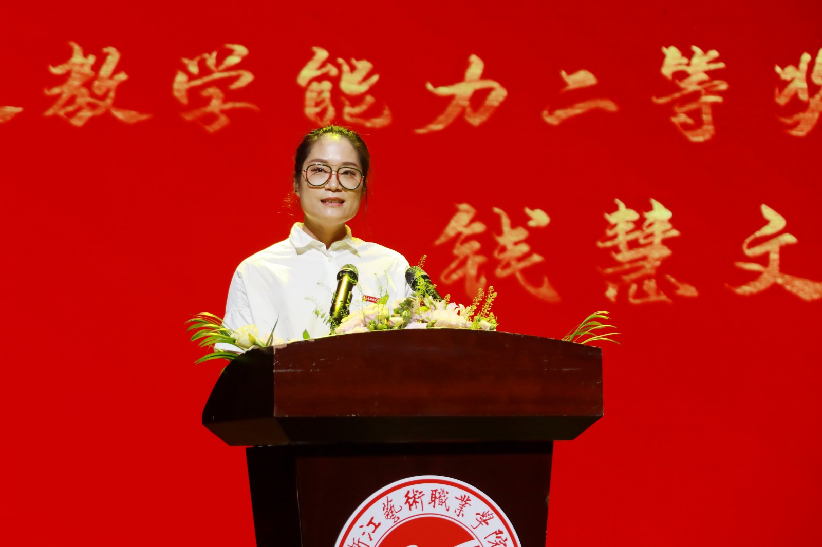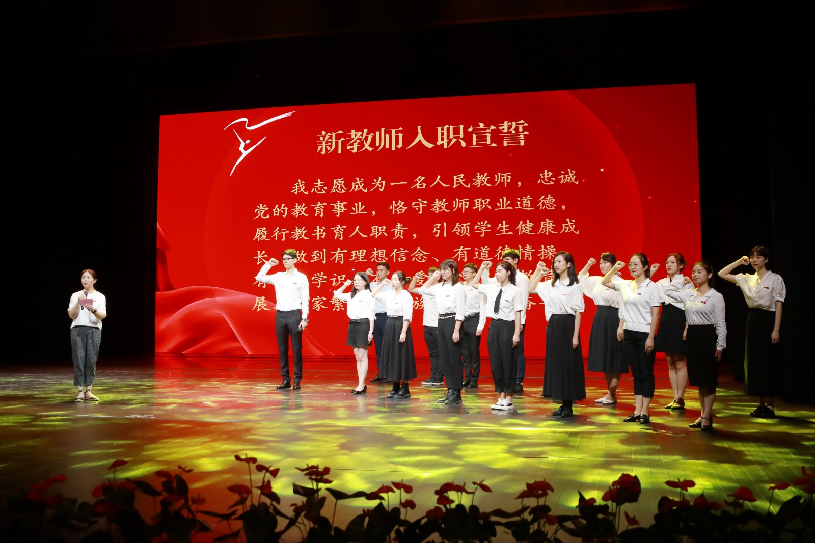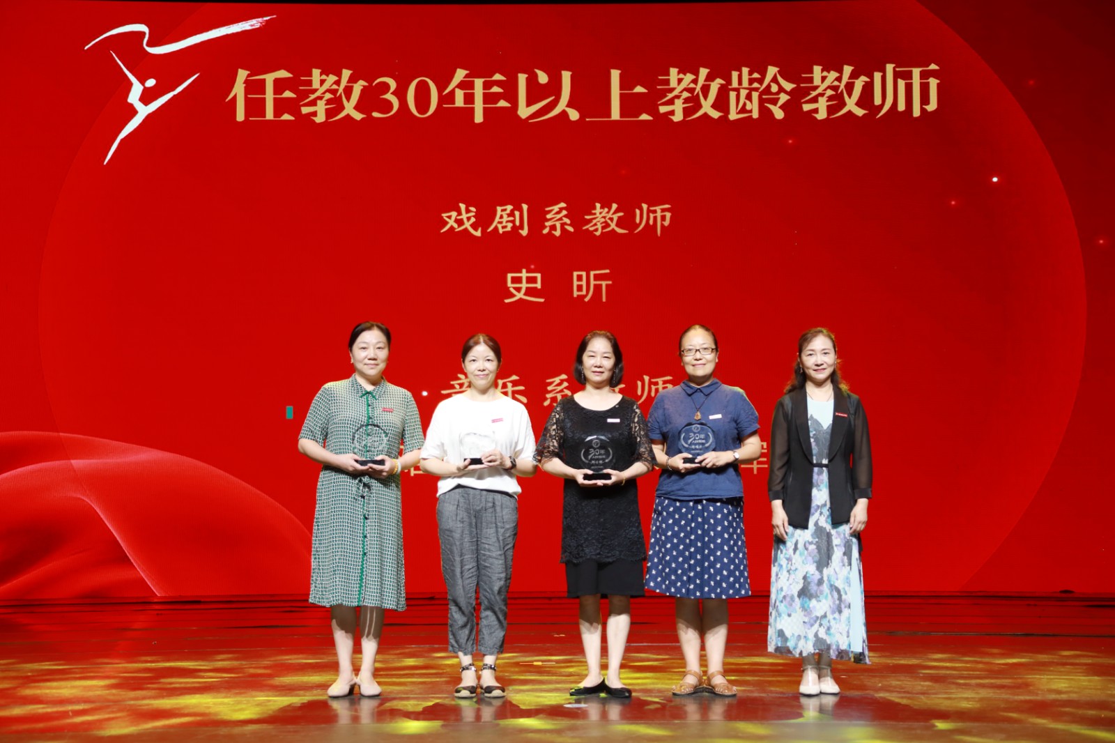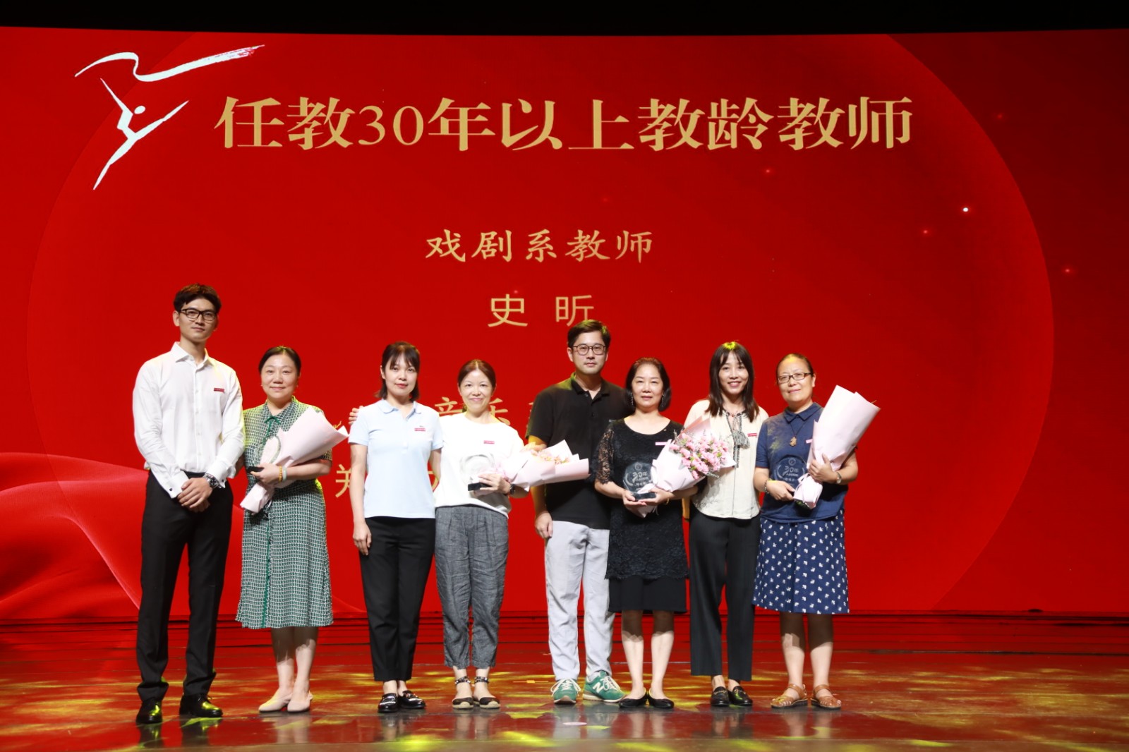 大会为30年教龄教师戏剧系史昕、音乐系郑难力、陈彤和邓世晖颁发了纪念牌。史昕表示,能从事自己热爱的事业非常幸运,每天和充满阳光朝气的学生在一起,我们就拥有了一个不会老去的灵魂和一颗不会老去的心。希望学校的青年老师们,不断创新,培养出一批批人才,结出累累硕果。黄龙文脉代代守护,浙艺精神代代相传,现场4位青年教师为老教师献上鲜花,接续传承。陈彤带领新教师进行了入职宣誓。