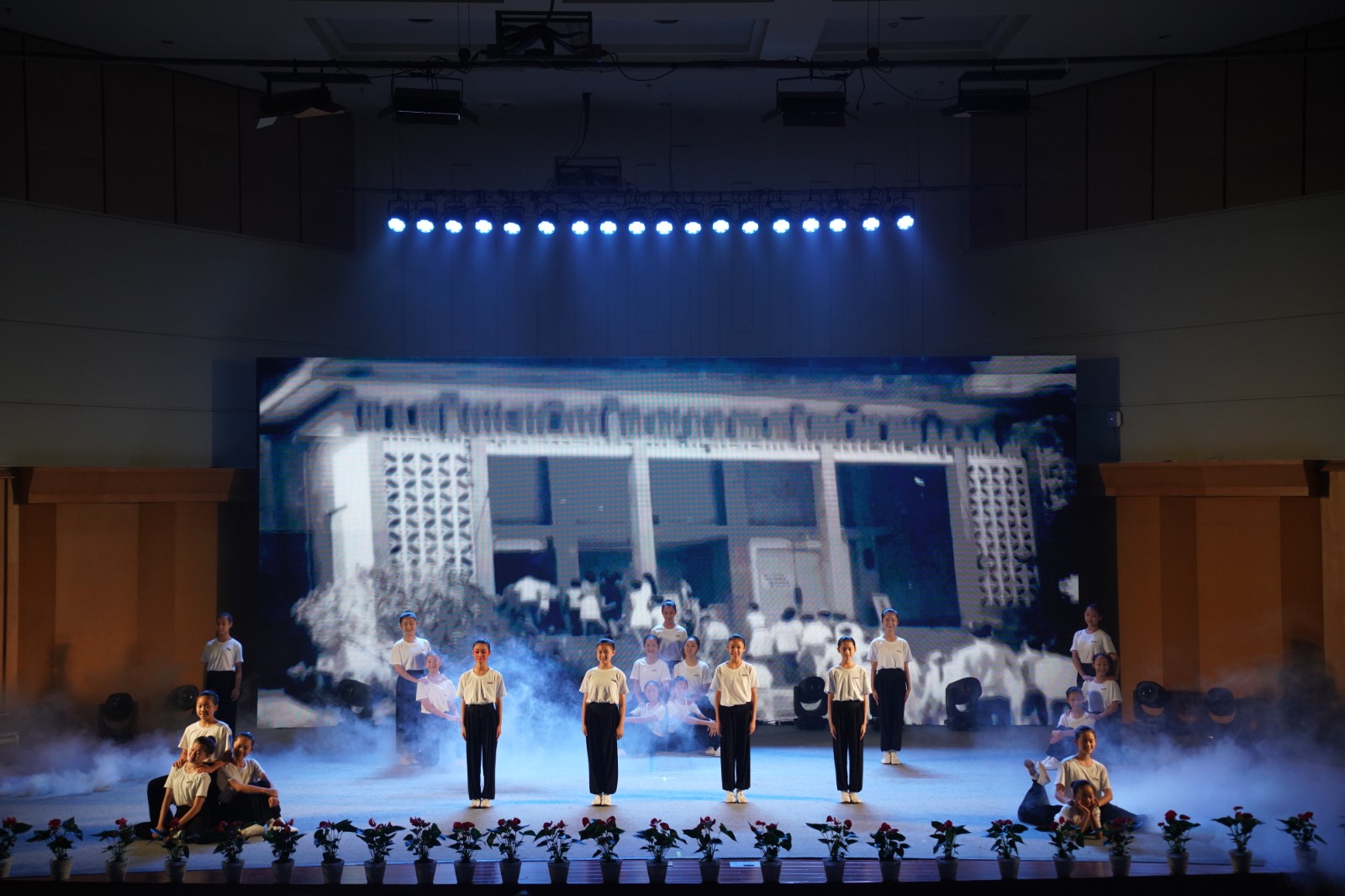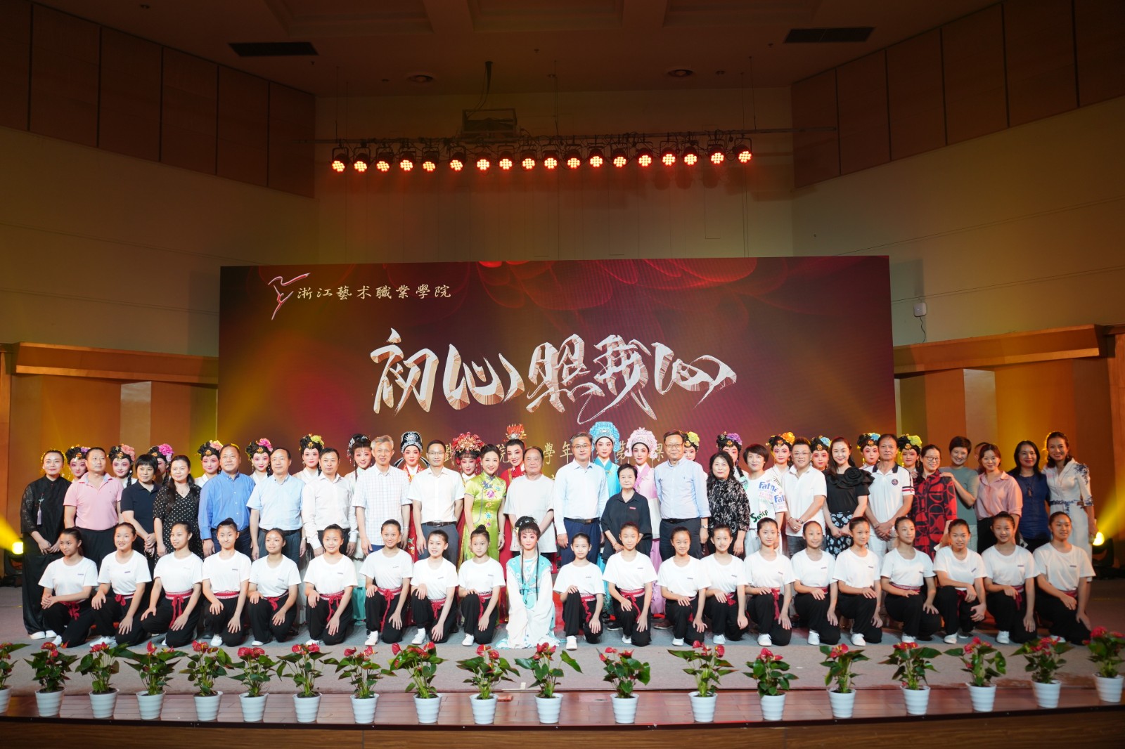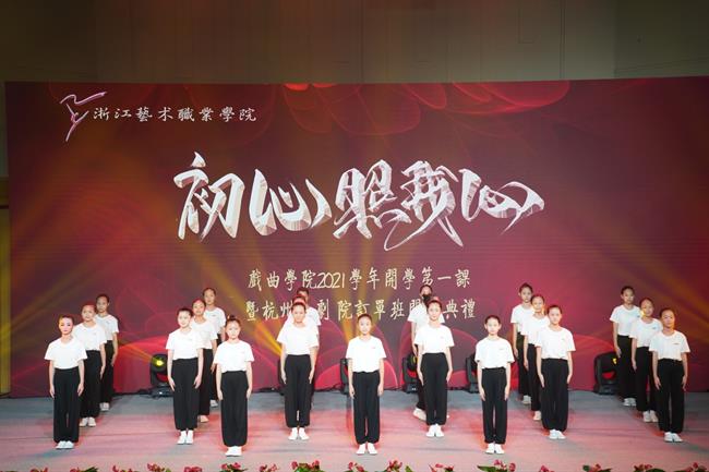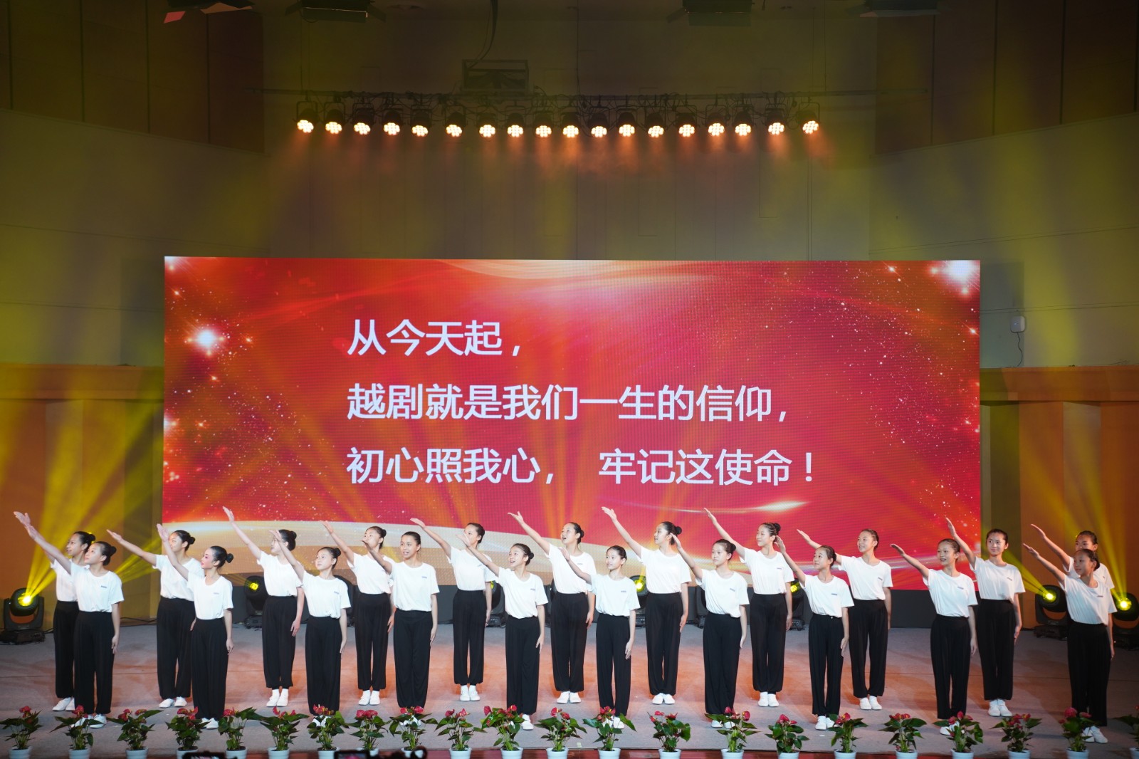 在浙艺校歌《梦想开始的地方》合唱声中,22名杭越班新生登场,行师礼、系腰带、诵校训,以传统庄重的方式开启了她们的越剧之路。