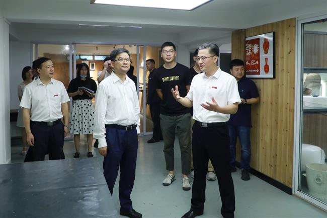 李志龙一行参观了国家“双高”专业群领衔专业戏曲表演专业教学场地、中央财政支持重点建设专业文物修复专业实训室等。在走访慰问,李志龙向老师们送上了问候;在陶艺实训室,与我校文物修复与保护专业教师进行深入交流。他肯定了浙艺的教学水平和取得的教学成果,代表滨江区我校全体教职工致以节日的问候,对学校的办学理念、人才培养、教育教学等方面给予了充分肯定。李志龙对学校为高新区(滨江)的发展建设所发挥的作用表示感谢,并希望学校能够继续发挥学科人才优势和社会服务功能,积极参与高新区(滨江)建设,推动全区教育事业发展再上新台阶。