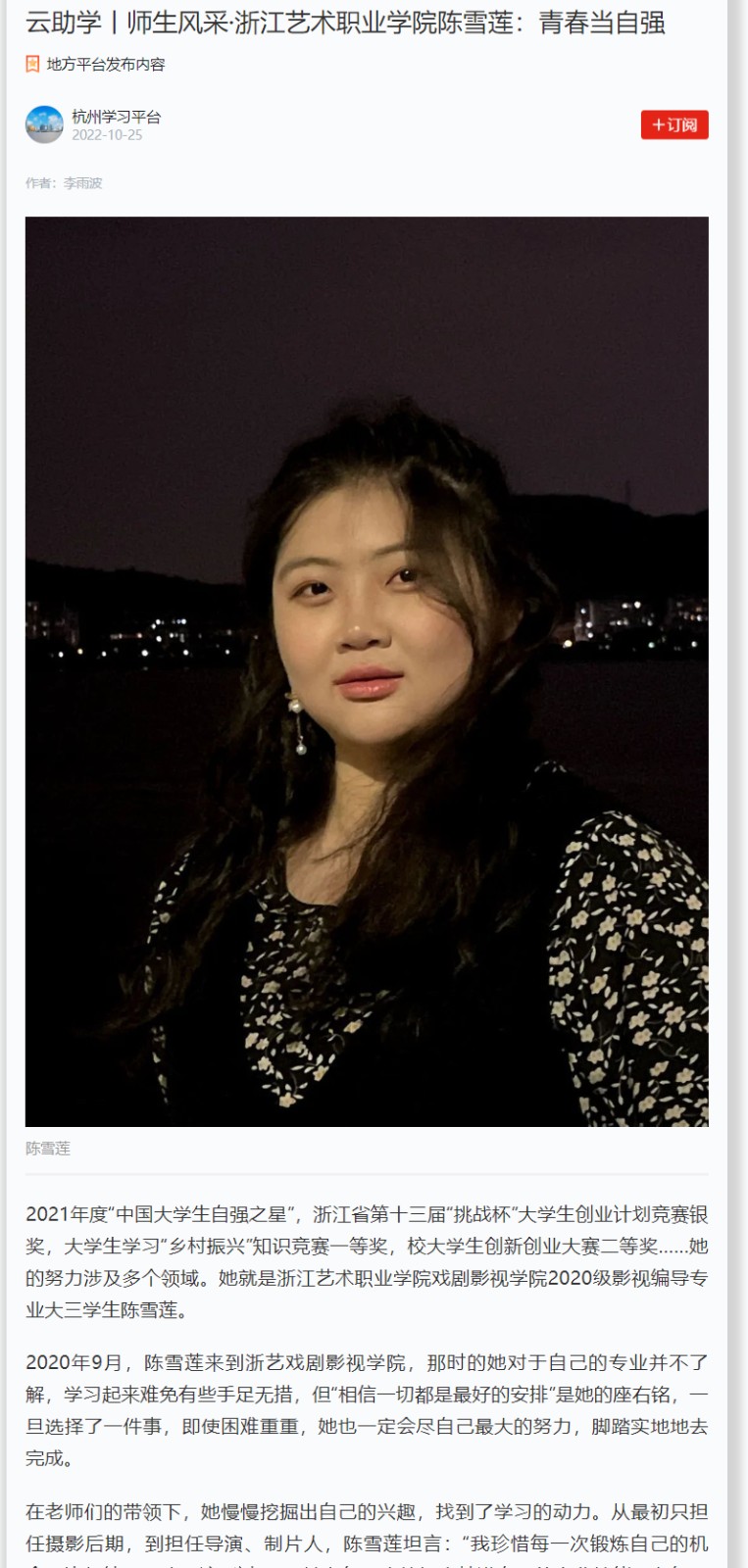2020年9月,陈雪莲来到浙艺戏剧影视学院,那时的她对于自己的专业并不了解,学习起来难免有些手足无措,但“相信一切都是最好的安排”是她的座右铭,一旦选择了一件事,即使困难重重,她也一定会尽自己最大的努力,脚踏实地地去完成。