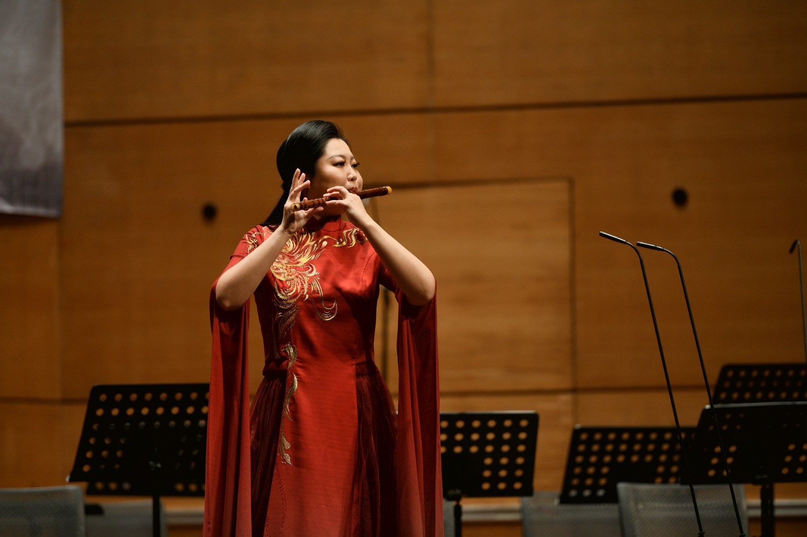 音乐会共有七首风格迥异的曲目,既有清新脱俗的“新派”作品《小放牛》和婉约细腻的南派作品《幽兰逢春》,又有豪迈铿锵的北派作品《秦川情》和富有山东地域特色的《走进快活岭》,还有富有传统韵味和时代特色的作品《春风雨夜情》和《胡旋舞》。值得一提的是,常轶伟演奏了恩师戴亚教授创作的北派笛子作品《山野情》。