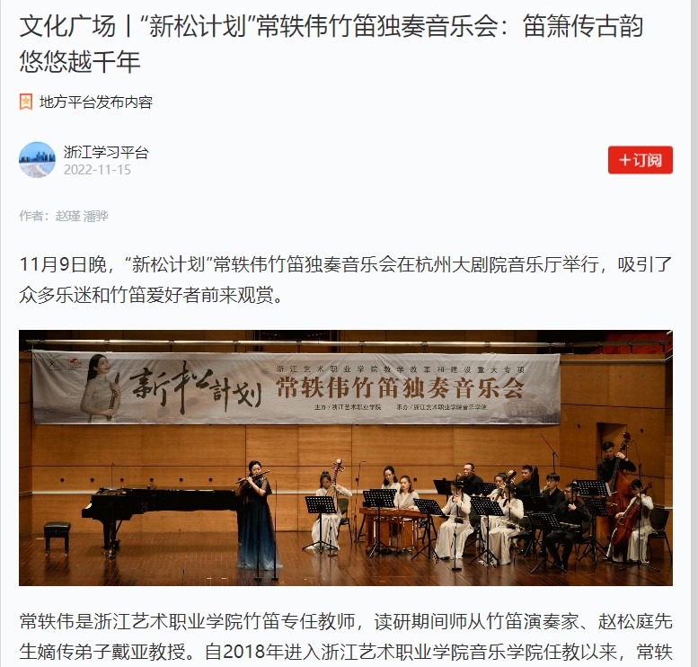 学习强国浙江平台:文化广场丨“新松计划”常轶伟竹笛独奏音乐会:笛箫传古韵 悠悠越千年