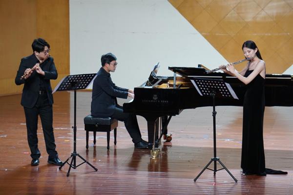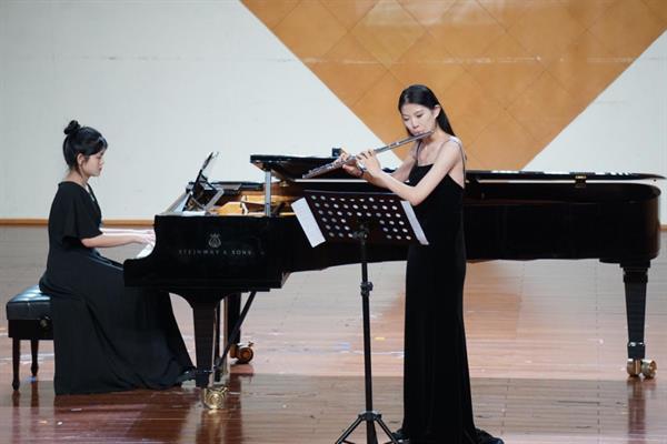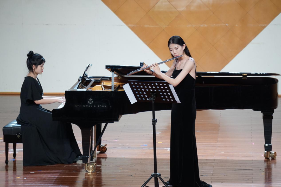 22级新生万宏屹是学院第一位三年制中专学长笛的学生,他与19键盘一贯班的郑好配合演奏的《D大调长笛协奏曲》是莫扎特很有代表性的作品,对技巧、气息、节奏都需要有较好的把控。