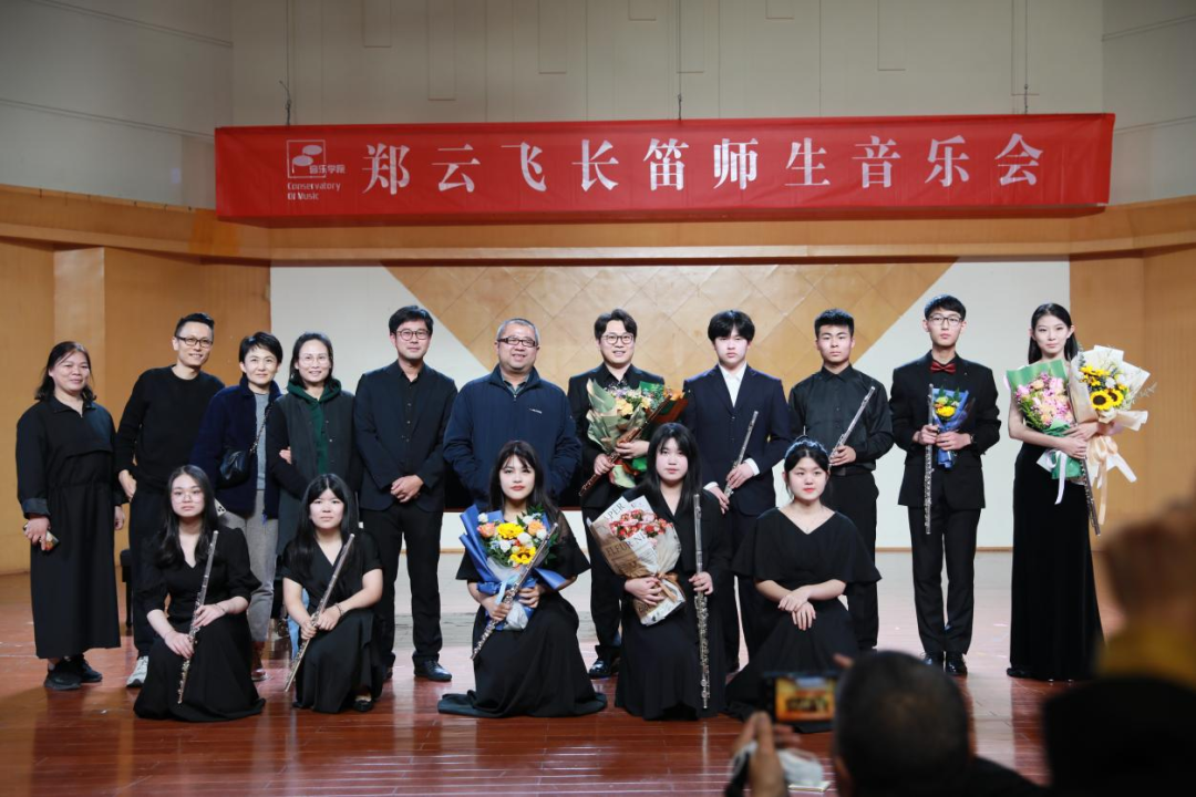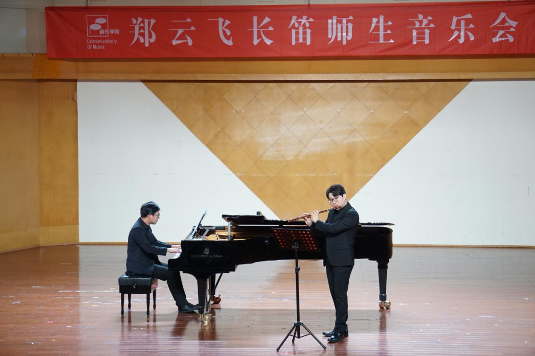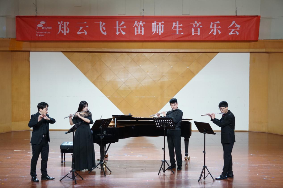 音乐会上,郑云飞演奏了巴赫的《降E大调奏鸣曲》和德彪西的长笛无伴奏作品《芦笛》, 这两首不同风格的作品将音乐会推上了高潮。之后,与学生合作演奏了长笛四重奏、二重奏。师生同台,用长笛建立起的情感,又用情感吹出了每一个乐句。