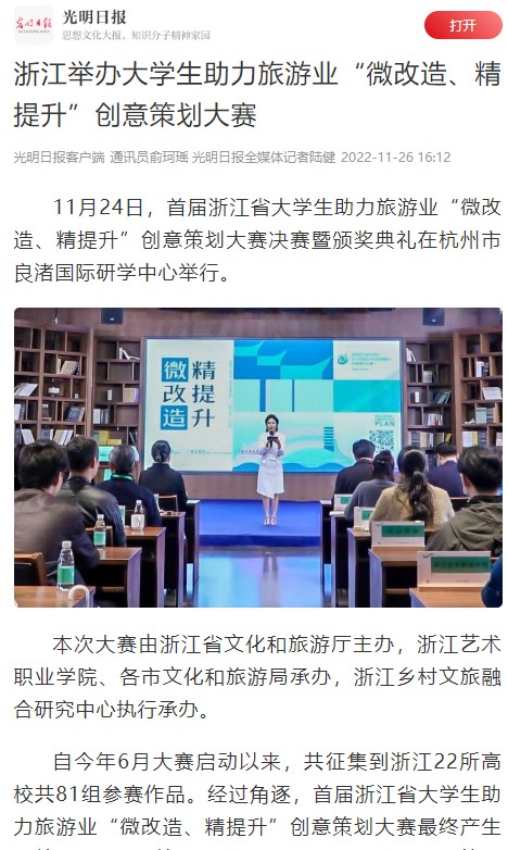 自今年6月大赛启动以来,共征集到浙江22所高校共81组参赛作品。经过角逐,首届浙江省大学生助力旅游业“微改造、精提升”创意策划大赛最终产生一等奖4个,二等奖7个,最佳创意奖1个,最佳策划奖1个,同时公布了10个三等奖、10个优秀奖和5个最佳组织奖名单。