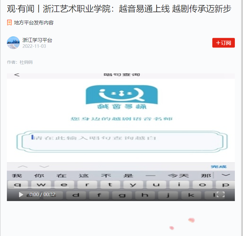 《越音易通》APP是国内外首创的戏曲(越剧)查字翻译电子字典,这项研究开发填补了越剧音韵理论与新媒体技术融合的空白,为戏曲学习与电子工具结合提供范例。