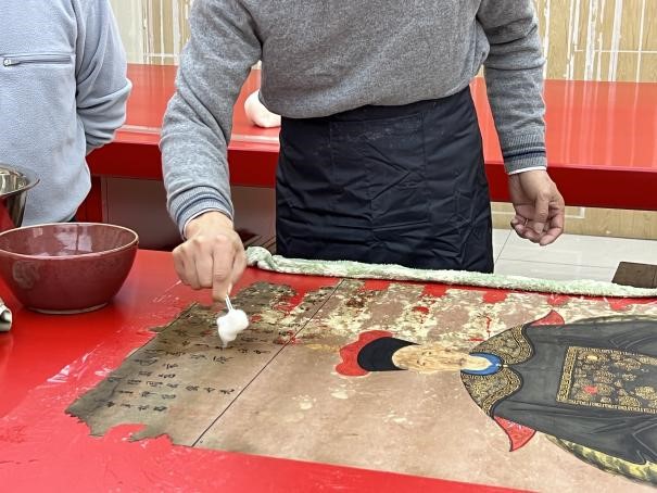 此次讲座采用理论知识讲解和实践技艺操作相结合的形式进行。刘德龙表示古旧书画修复既要求经过历史考究的修复计划,又需要高超的修复技艺和细心、耐心,在修复中要坚持遵循 “修旧如旧,最小干预”的原则,尽量减少对字画的负面影响。刘德龙为同学们重点讲授了古旧书画修复的起源、原则,并实践演示修复的过程。古字画修复有四大步骤:一、洗,清洗完书画表面的污渍、霉渍、水渍等;二、揭,揭命纸,粗揭命纸后对画芯进行修复;三、补,修补由于虫蛀等原因造成的破洞、折痕等方面问题;四、全,全色,在有破洞、缺损的地方,进行颜色恢复。