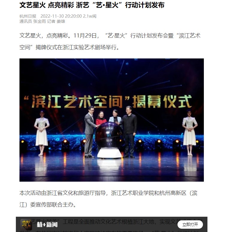 文艺星火,点亮精彩。11月29日,“艺·星火”行动计划发布会暨“滨江艺术空间”揭牌仪式在浙江实验艺术剧场举行。