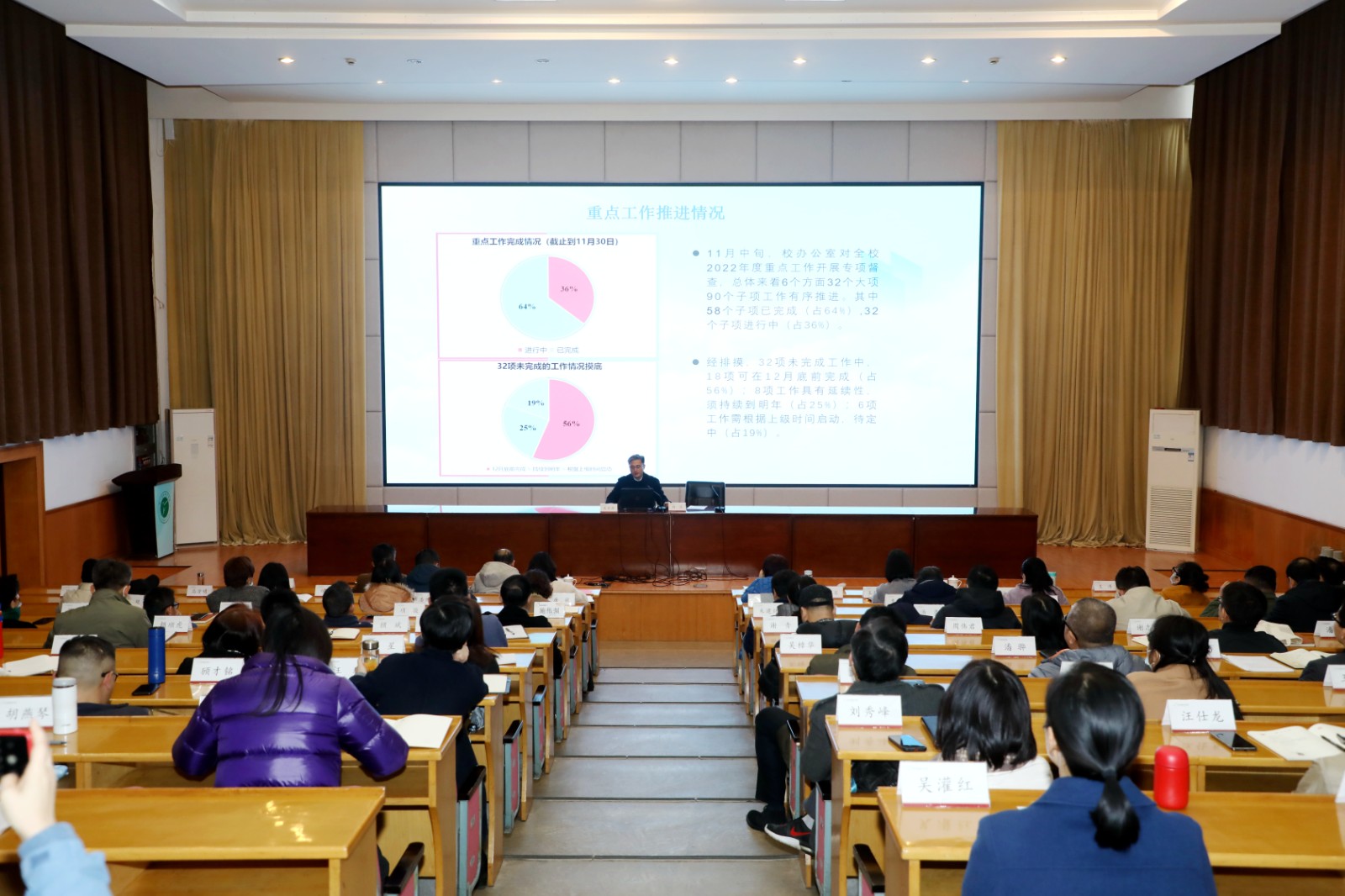 本期初心讲堂晾晒了学习宣传贯彻党的二十大精神量化考评、重点工作推进、专项经费执行进度、“到课啦”教师使用情况、外聘师资督查情况、中专期中考试我校与校外重高某班比对情况等指标。薛亮对每个指标数据进行了细致分析和解读,肯定了大家的付出和努力,希望大家再接再厉,找准学习贯彻落实党的二十大精神的结合点,切实把党的二十大精神学习成效转化为推动学校高质量发展的生动实践。