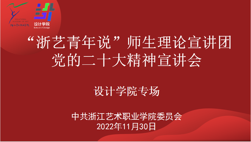 为学习宣传贯彻党的二十大精神,引导我院师生深刻把握党的二十大的重要思想、重要观点、重大战略、重大举措,11月30日,“浙艺青年说”师生理论宣讲团党的二十大精神宣讲会——设计学院专场在阶梯一开展。设计学院学生党员、入党积极分子、团学干部、第40期党校学员以及各班代表到场聆听。