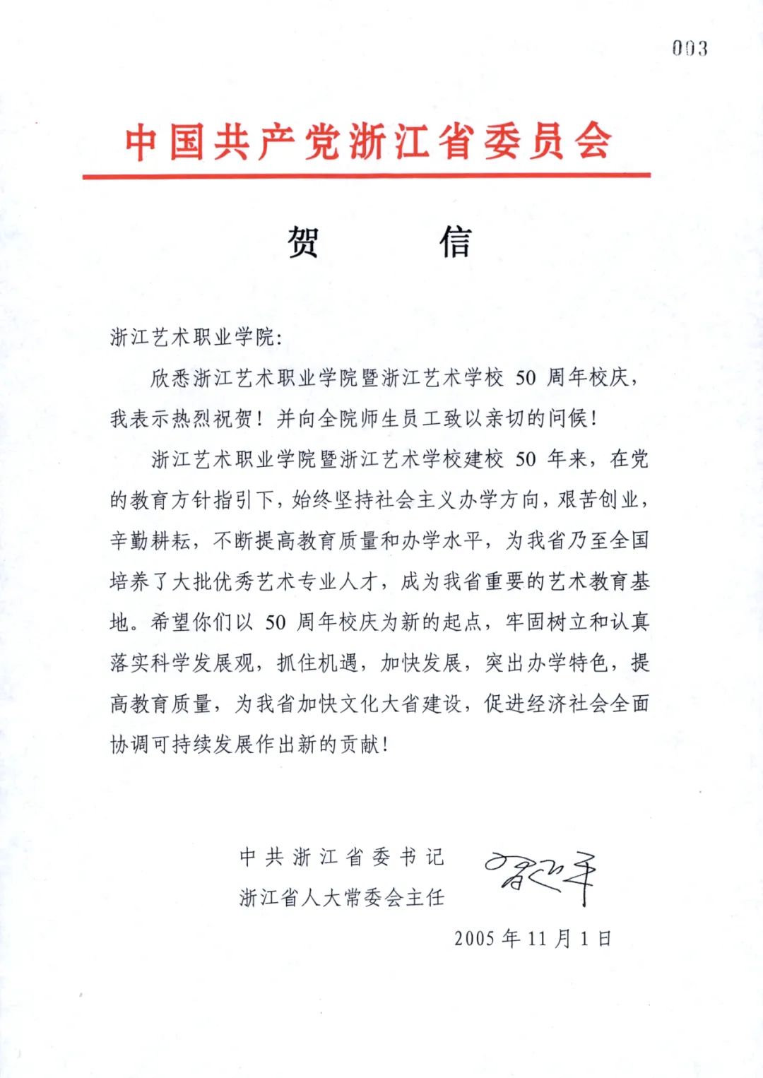 2005年11月,时任浙江省委书记、省人大常委会主任习近平同志给我校建校50周年发来贺信