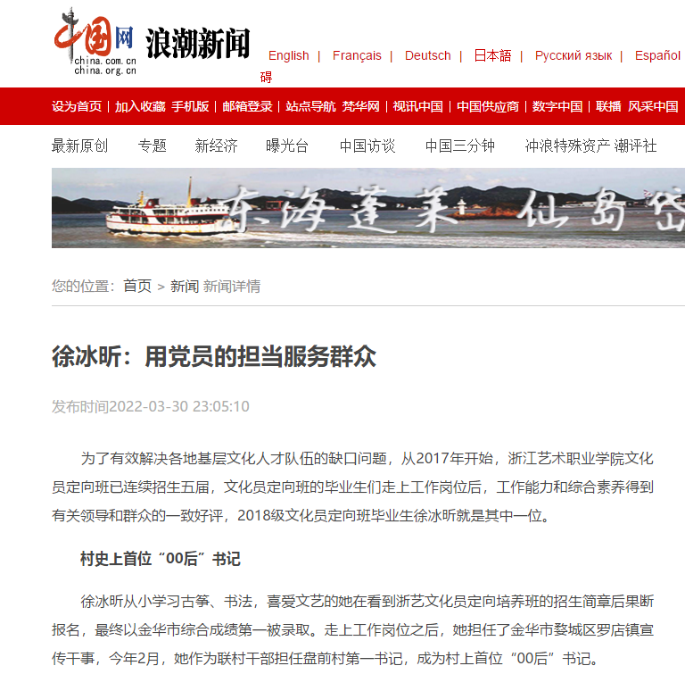 徐冰昕从小学习古筝、书法,喜爱文艺的她在看到浙艺文化员定向培养班的招生简章后果断报名,最终以金华市综合成绩第一被录取。走上工作岗位之后,她担任了金华市婺城区罗店镇宣传干事,今年2月,她作为联村干部担任盘前村第一书记,成为村上首位“00后”书记。