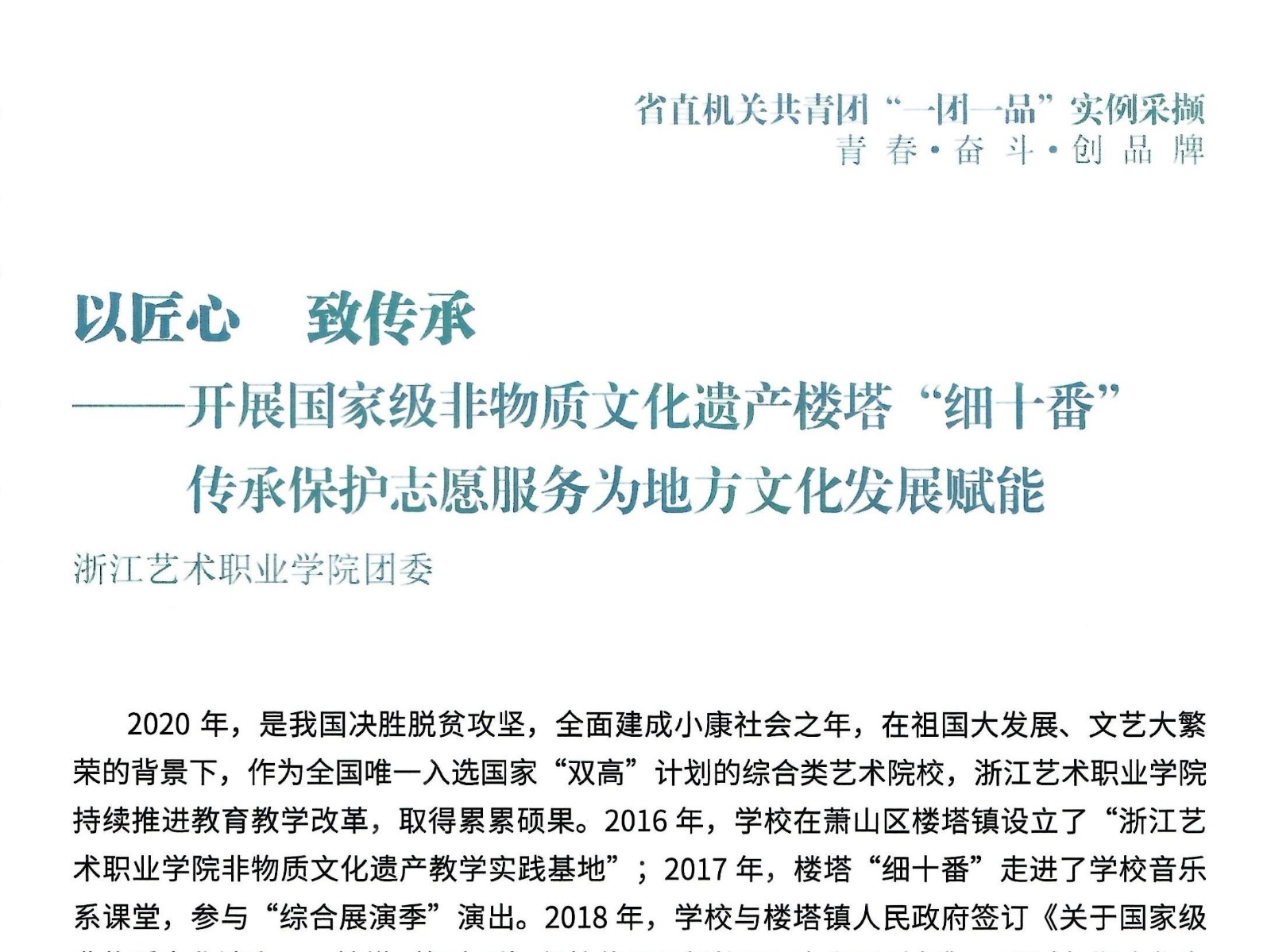在萧山区楼塔镇,师生连续五年为国家级非物质文化遗产“楼塔细十番”搭建起“老中青”三代结构合理的传承人梯队;在丽水市松阳县,青年师生用暑期社会实践将戏曲“科班”教学送到留守儿童身边,把松阳高腔的韵致之美永刻于影像之中;在云南省东川县,青年师生用新设计理念、新广告模式焕活农产品销售思路……在社区居家养老工作中、在疫情防控第一线、在市区文明宣贯课堂上,浙艺青年用志愿服务书写着新时代的担当。而在参与服务、投入实践、沉进民生、拥抱社会的过程中,浙艺青年的社会责任感显著增强,家国情怀得到激发,一大批创新创业成果也在服务实践过程中产生,连续获得浙江省“挑战杯”创业计划竞赛一等奖、职业规划大赛一等奖等荣誉。