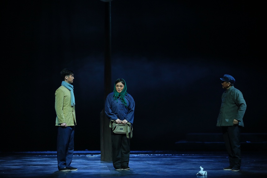 赵松庭无疑是一个善良的人,这在第六场中表现得特别明显。当时,已受政治迫害的赵松庭,面对凄风中年关将近,思乡之情不由自主跃上心头,对家人的牵念、对妻儿的亏欠,都成为他心头沉甸甸的包袱。这时,妻子只身前来探望他,让他既惊喜又害怕:惊喜的是梦想成真,阔别已久的爱人活生生站在面前;害怕的是自己会成为家人的负累。这种矛盾忐忑的心理,通过两人间的表演与对唱,起到了渲染气氛、营造意境的作用,也让观众从一个侧面去了解赵松庭丰富、细腻的内心世界。
