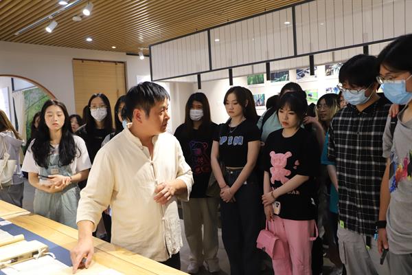 展览现场,朱中华为现场师生讲授了富阳竹纸制作技艺的发展历史,讲述从一根毛竹制作成一张纸的精细工艺和高超技术要求。同时带领现场师生体验“抄纸”流程,感受传统技艺的魅力。