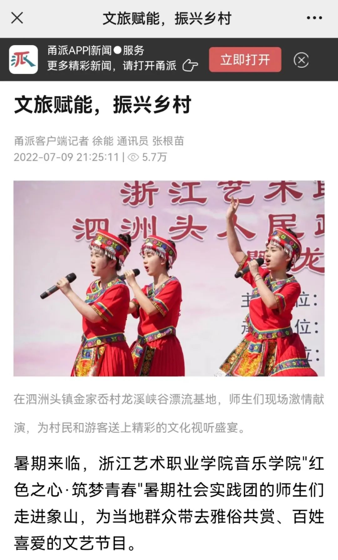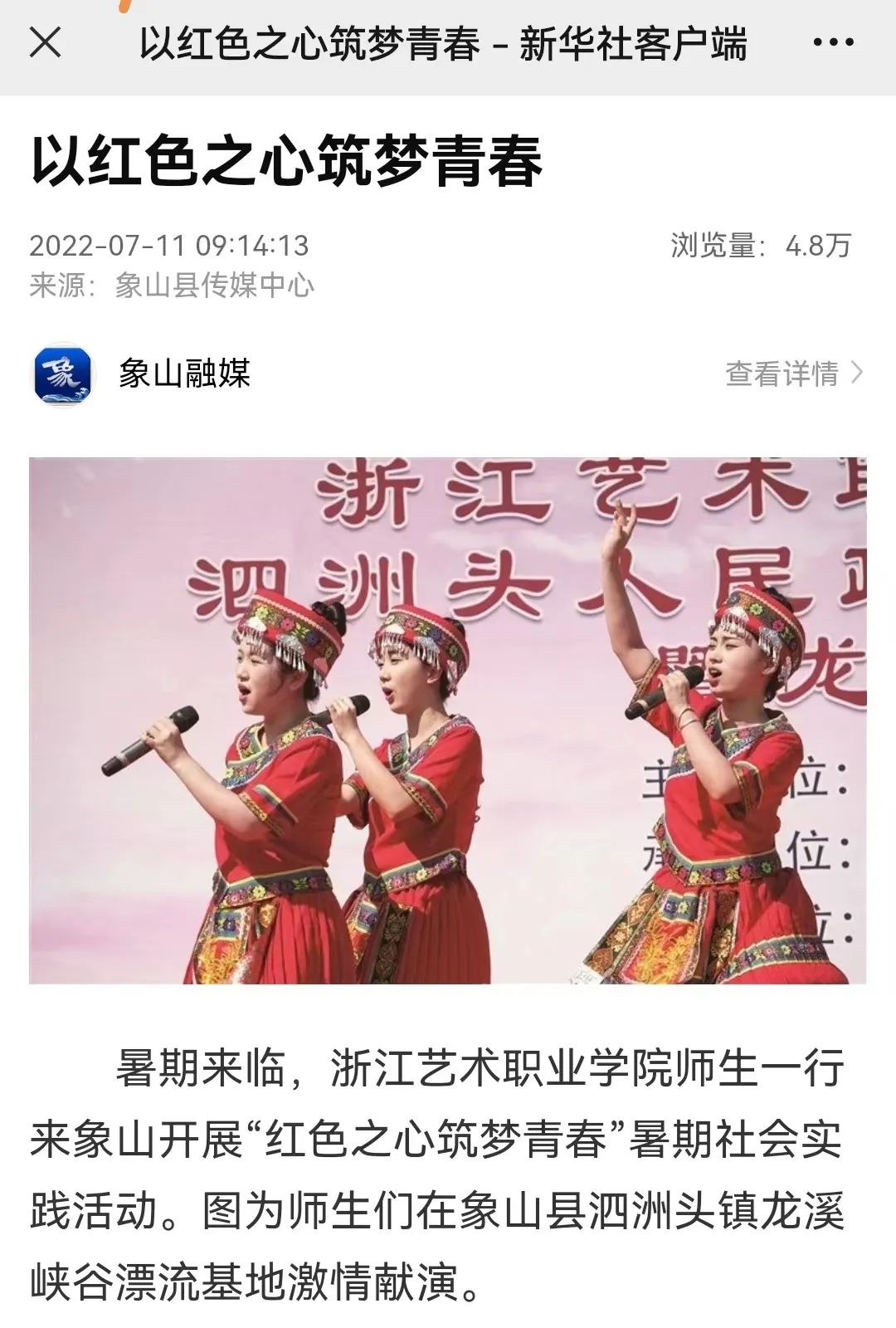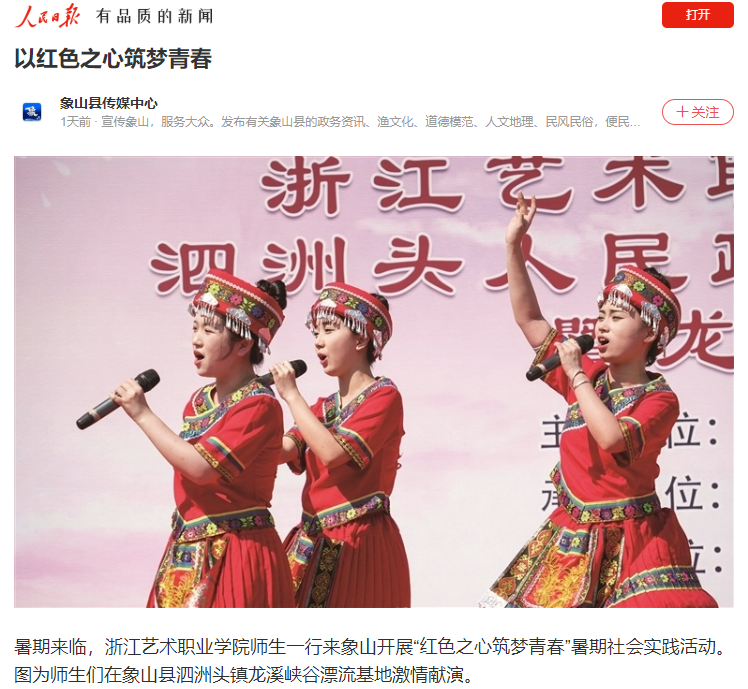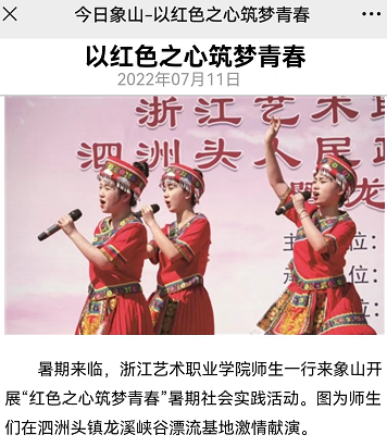暑期社会实践开展期间,新华社、人民日报、象山县传媒中心、象山融媒、今日象山等多家媒体分别对音乐学院“红色之心 筑梦青春”暑期社会实践团赴象山泗洲头镇开展文艺演出进行了报道和转载,有效提升浙艺音乐学院的社会影响力和美誉度。