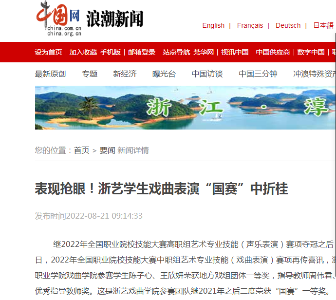 中国网浪潮新闻:表现抢眼!浙艺学生戏曲表演“国赛”中折桂