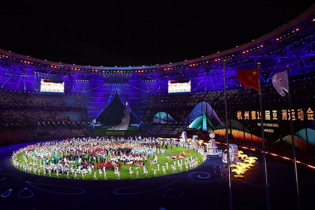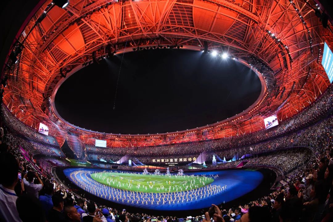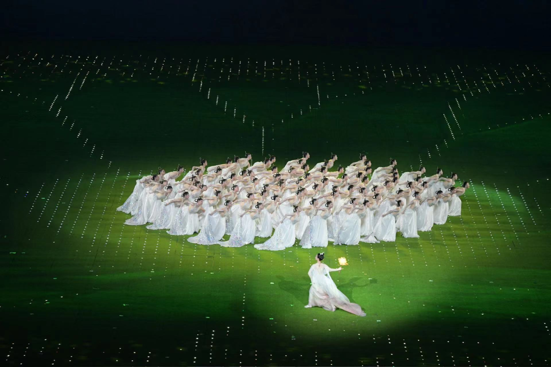 在火炬熄灭环节中,戏剧影视学院、音乐学院、演艺与教育学院学生在正对主席台主表演区核心区域进行歌舞表演,与数字火炬人“弄潮儿”一起带动现场观众对着火炬比心,见证亚运会火炬塔的熄灭。