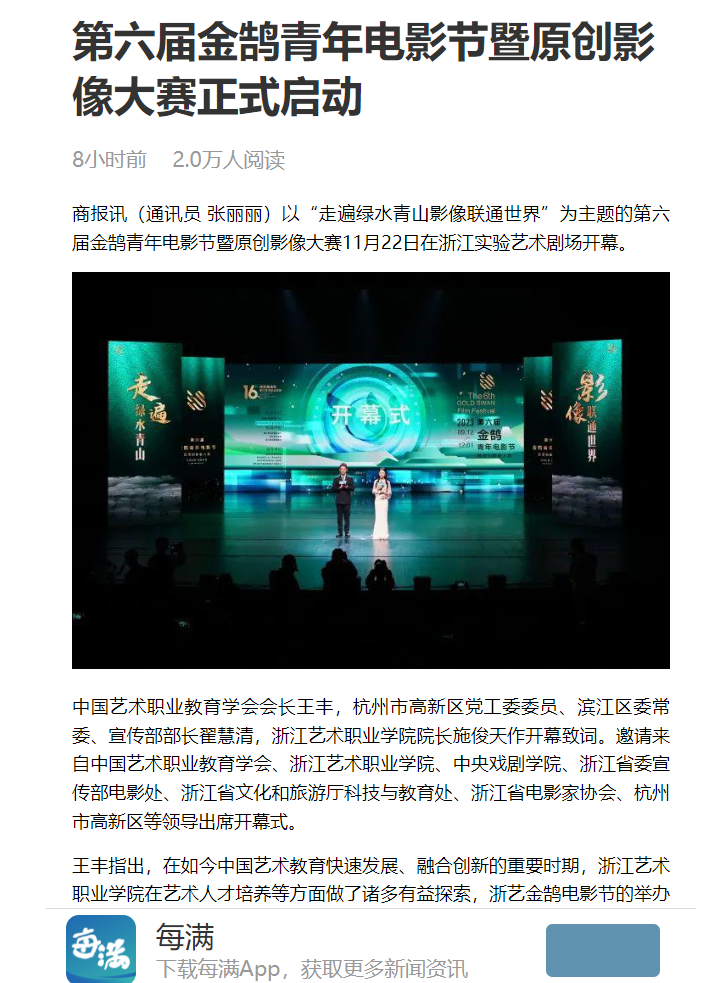 以“走遍绿水青山影像联通世界”为主题的第六届金鹄青年电影节暨原创影像大赛11月22日在浙江实验艺术剧场开幕。