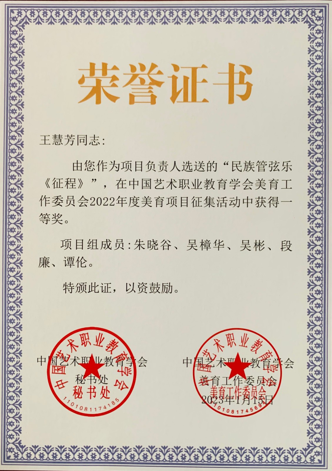 虎去兔来辞旧岁,欢歌笑语迎新春。新春佳节来临之际,“中国艺术职业教育学会美育工作委员会2022年度美育项目”评审结果揭晓,我校推荐参评的民族管弦乐《征程》(项目负责人王慧芳)获得个人奖项唯一的一等奖,另有8个作品获评优秀项目,我校获评“优秀组织单位”。