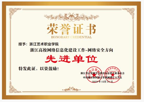 近日,浙江省计算机学会教育信息化专业委员会、中国教育和科研计算机网浙江主节点联合表彰了一批2023年高校网络信息化建设先进单位和先进个人。我校喜获“2023年浙江高校网络信息化建设先进单位-网络安全方向”“2023年浙江高校网络信息化建设先进单位-数字治理方向”两项荣誉,图书信息中心卓然荣获“浙江高校网络信息化建设先进个人”。