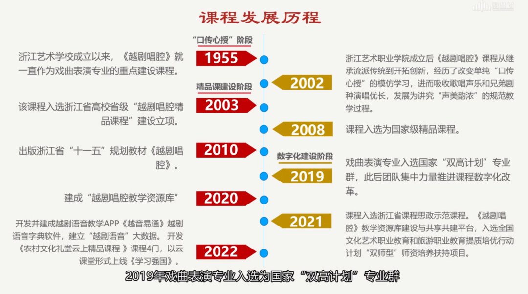《中国越剧·唱腔》课程由浙艺戏曲学院副院长周伟君领衔研发,该课程突出越剧艺术的人文性、经典性、传承性,通过巧妙布局、循序渐进的教学板块,融合“越剧音乐发展史”“越剧语音知识”“越剧演唱元素训练”“流派特征介绍”“经典唱腔浅析”五个教学模块,引领学习者由浅入深了解唱腔之美,有效实现专业技能与艺术素养的渐进提升,达成“演学结合、知行合一”,激发学习者传播地方戏曲之美、传承中华传统文化,践行文化自信的使命感与责任感。