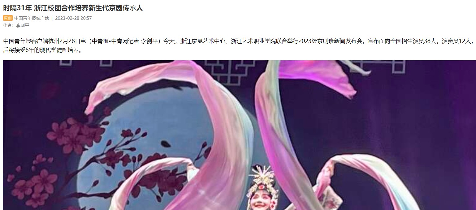 中国青年报:时隔31年 浙江校团合作培养新生代京剧传𠄘人
