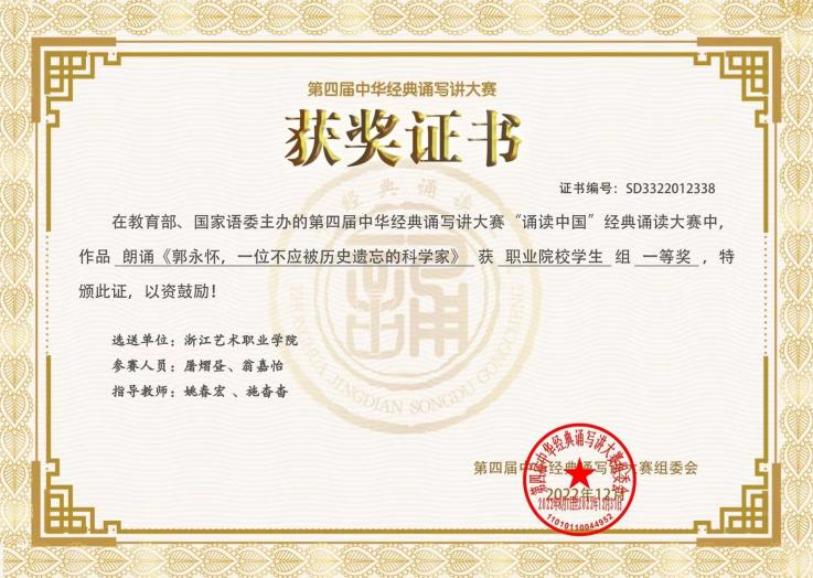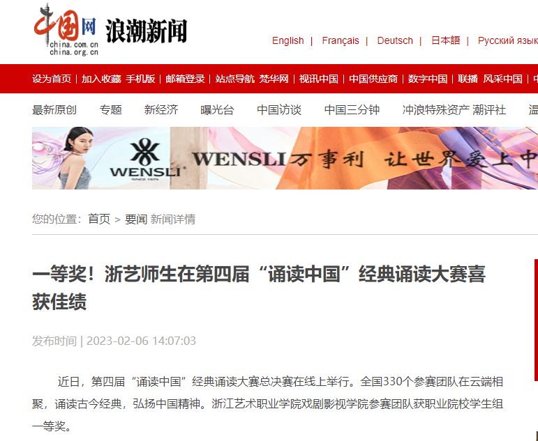 中国网浪潮新闻:一等奖!浙艺师生在第四届“诵读中国”经典诵读大赛喜获佳绩