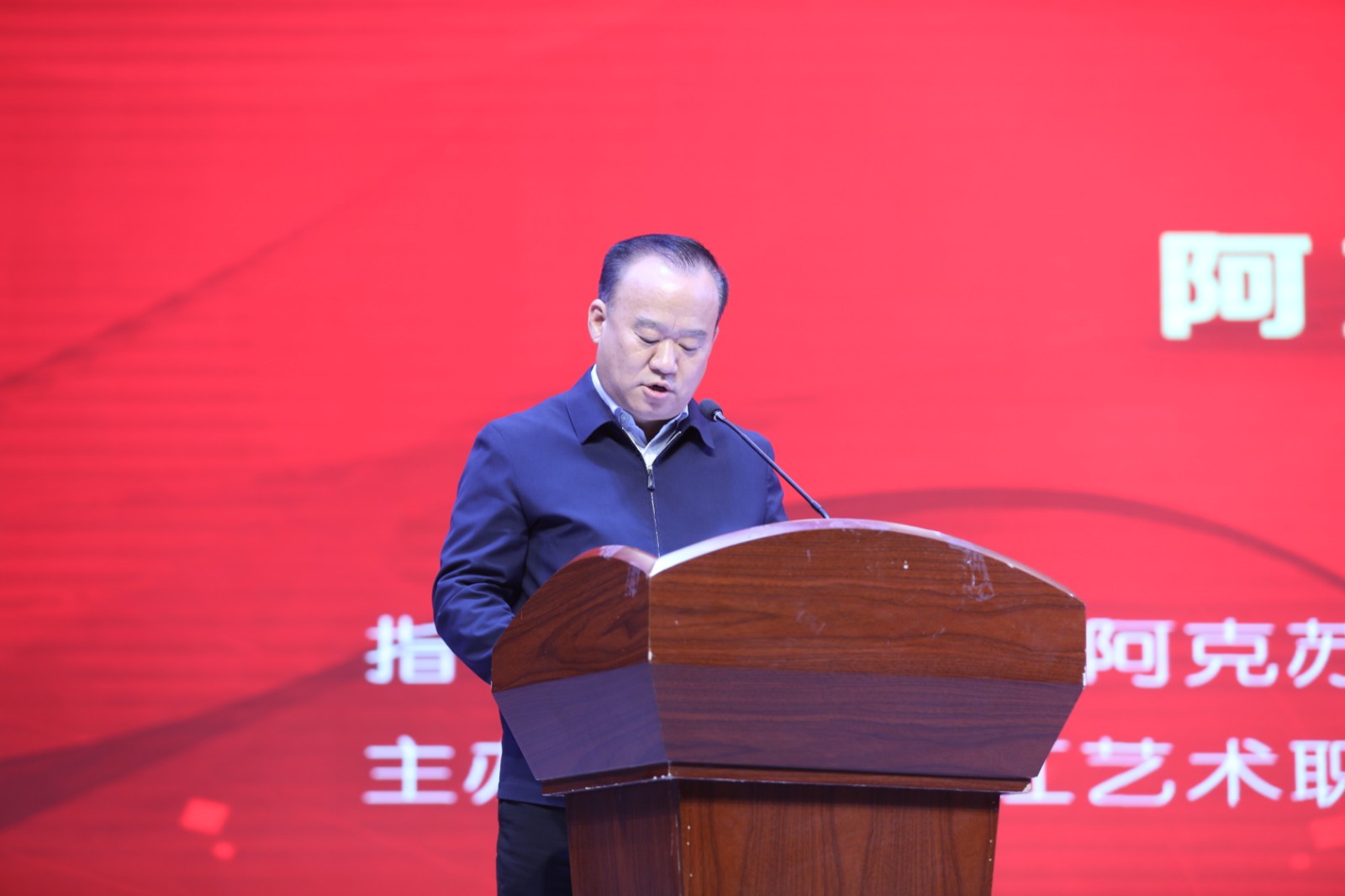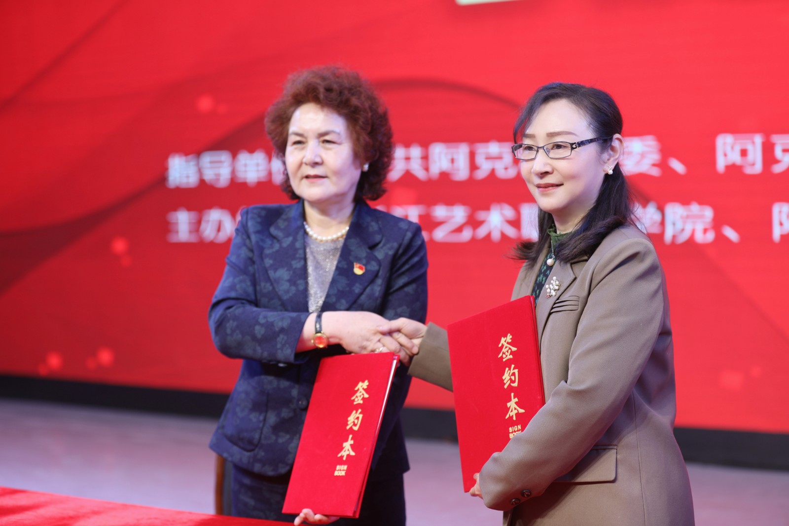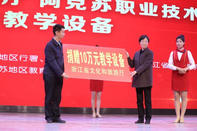 省文化和旅游厅党组成员、副厅长朱海闵,省援疆指挥部党委副书记、副指挥长王忠民,阿克苏地委委员、宣传部部长常玉轩出席浙阿艺术院校合作共建仪式,为共建产学研基地、文化润疆人才培养平台、浙阿戏曲工作坊分别揭牌,观摩“组团式”文化援疆成果汇报。
