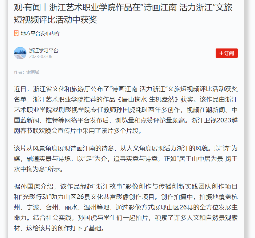 “这部片子虽只有短短几分钟,但参与人员从前期拍摄到后期制作却有几十人。片子能获奖,感谢学校给予的平台,感谢学校领导给予的支持和帮助。今后在教学中将继续围绕浙江本土文化进行创作,用光影展现浙江的诗意,传承发扬传统文化。”孙国虎说。
